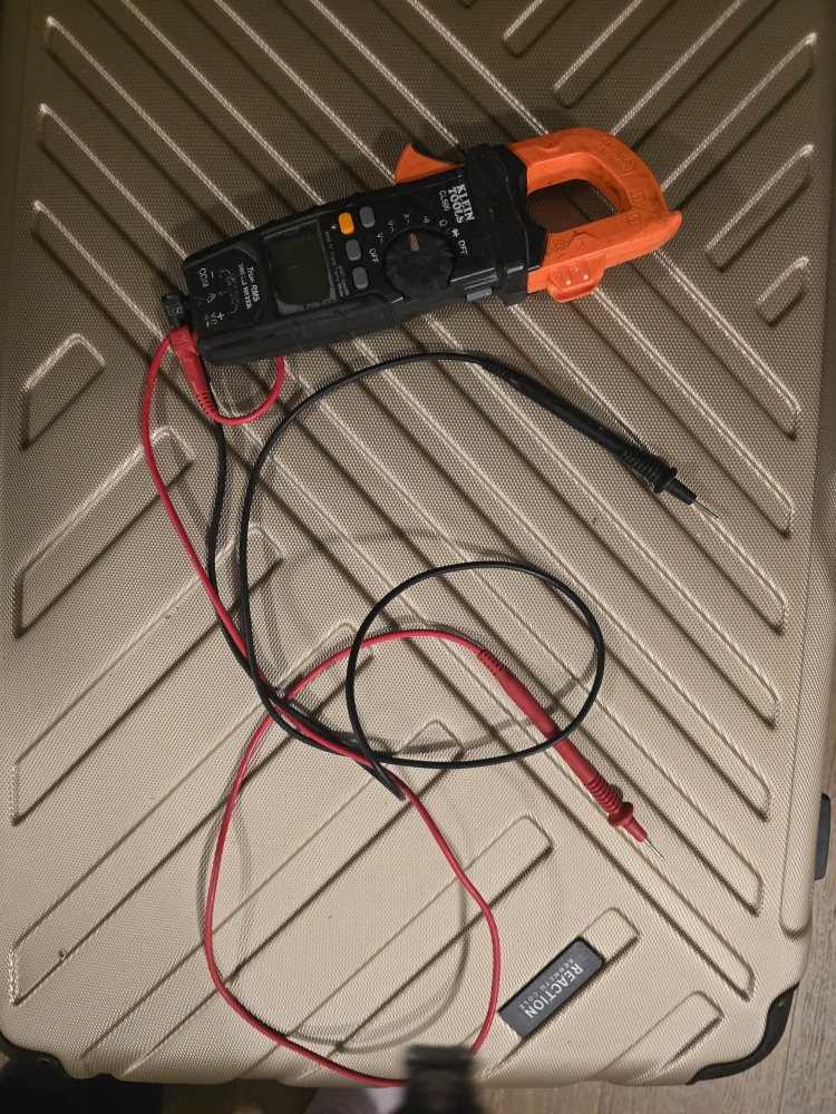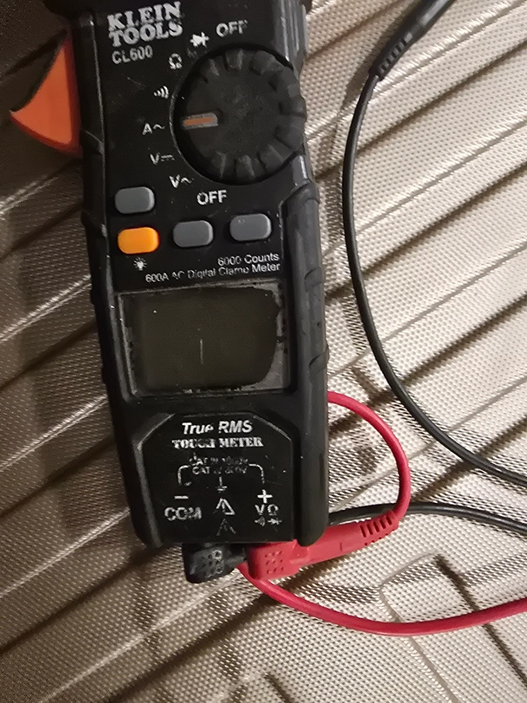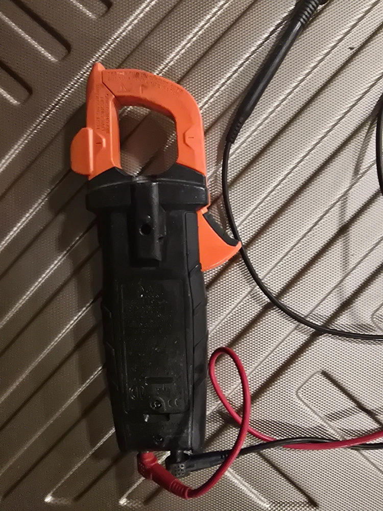 The meter is black, with a rotating dial and buttons. The meter has an orange clamp, and has red and black wires. Think about the comfort of testing the flow of electricity in your home.