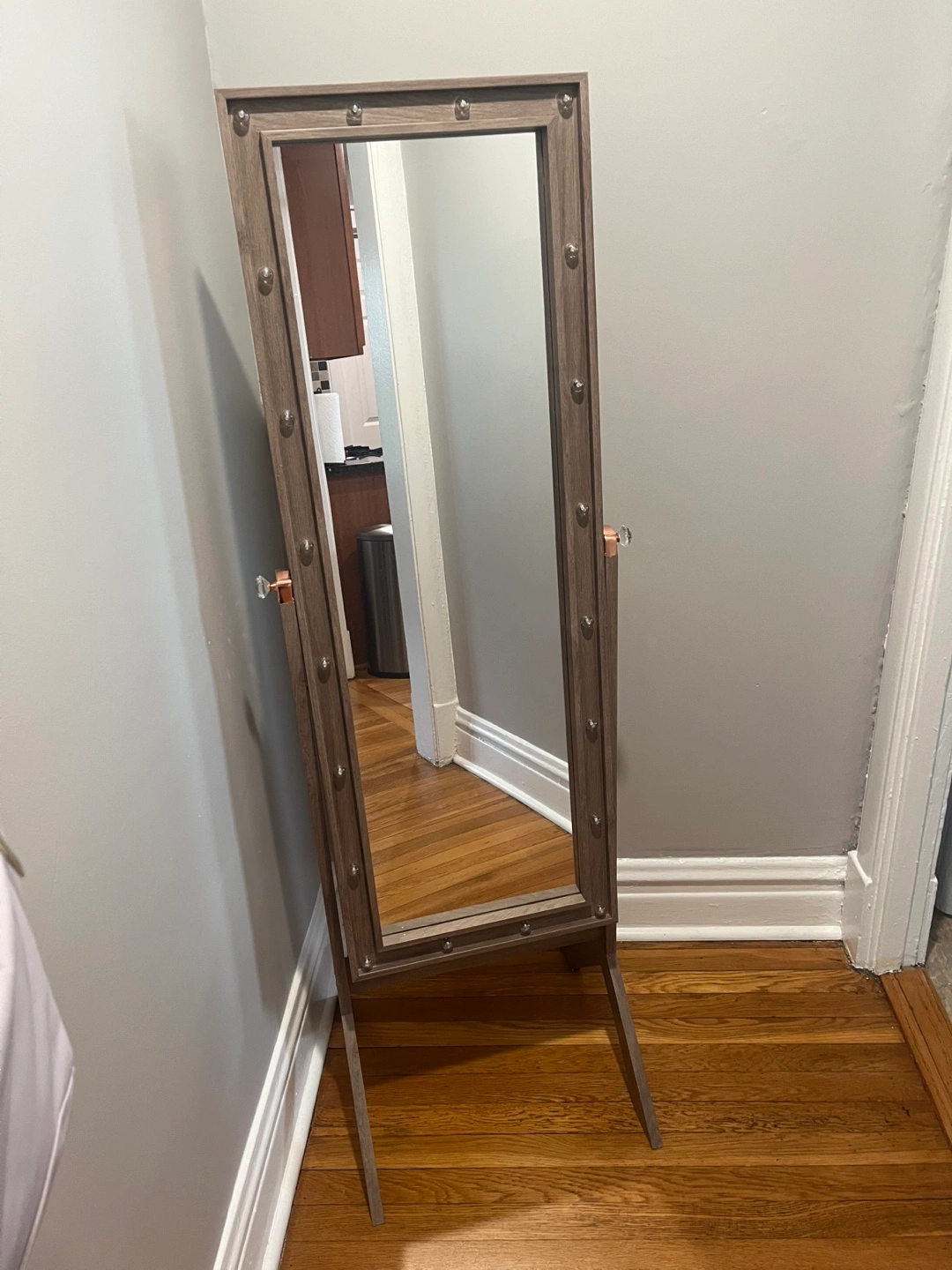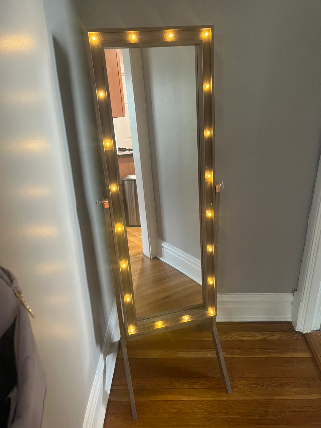 Full length standing mirror. Features lights and knobs on the sides. The frame has decorative studs. The mirror rests on a stand. Size of just the mirror is 16.75 inches by 46.75 inches. Dimensions listed above are for the size including width with the knobs and height including the base stand. Item is basically new, have only had for 2 months. Works well, I just no longer need it due to moving. Lights are battery operated, you do not need to have an outlet nearby.