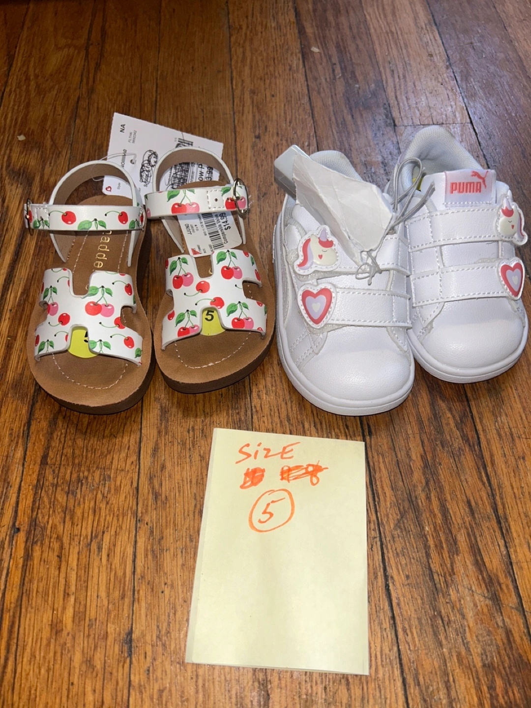 245A pair of sandals with a cherry print design, and a pair of white sneakers with heart and unicorn accents. You will feel so much relief knowing your child will be able to walk around comfortably. Brand new size 5