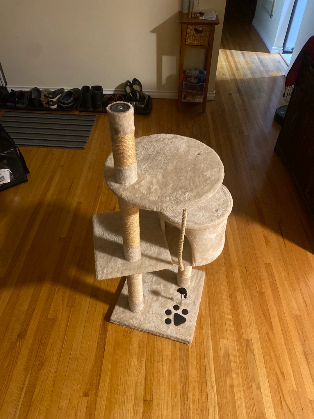 A beige cat tree. Includes multiple platforms and scratching posts. A cozy enclosed space for your cat to rest. Perfect for keeping your cat entertained. Top tier shelf missing , scratch pad still like new