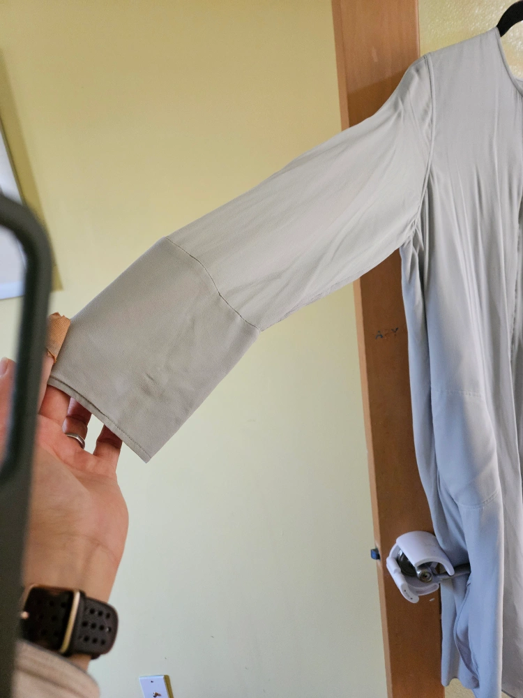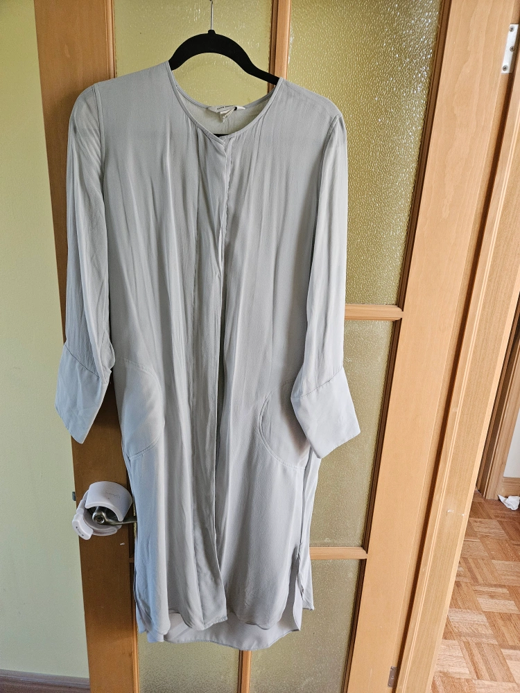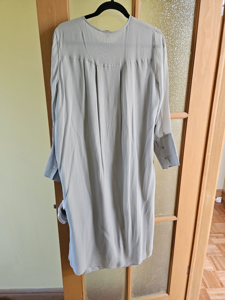 Light grey coloured, long-sleeved dress. Features a rounded neckline. .