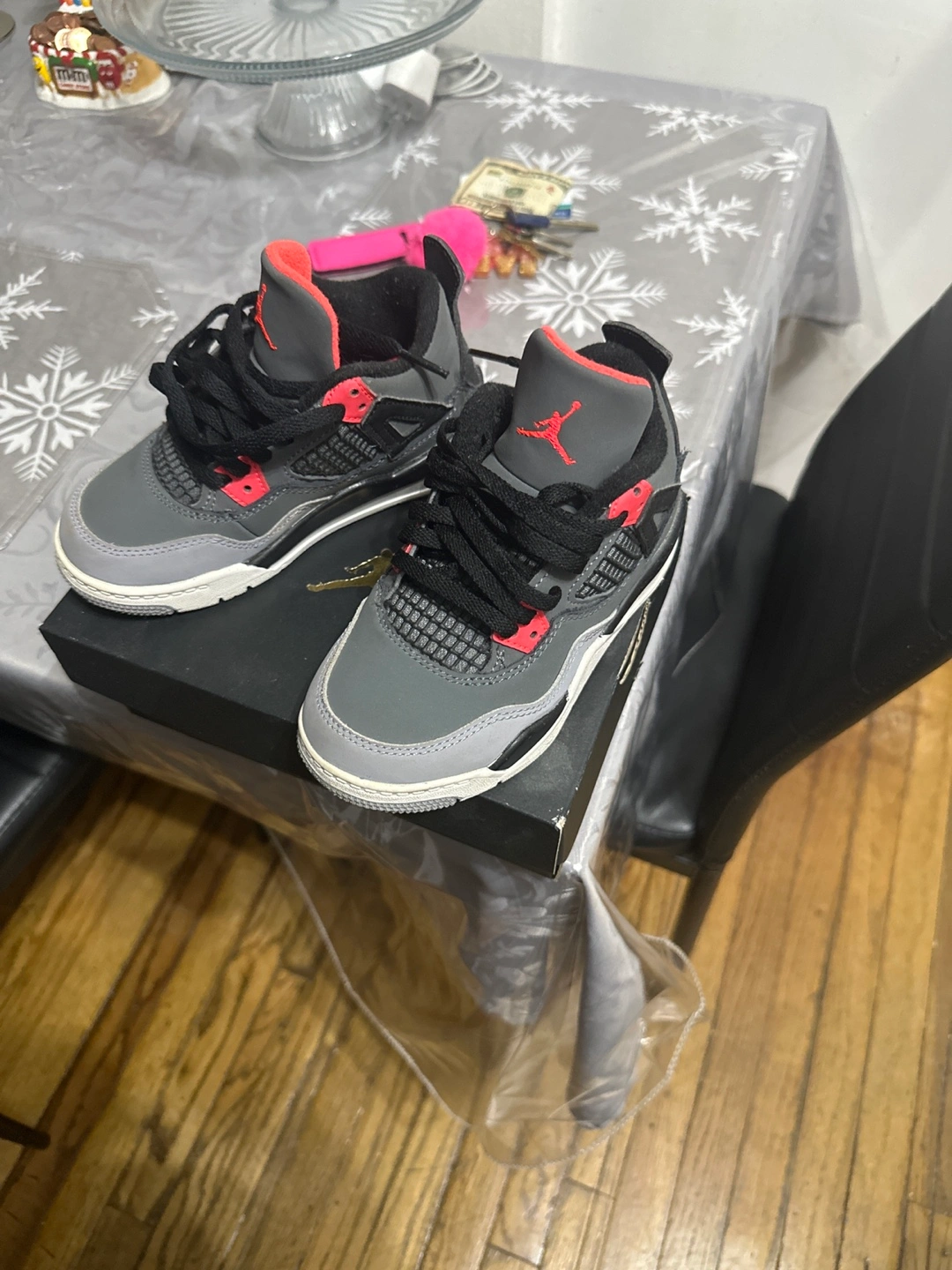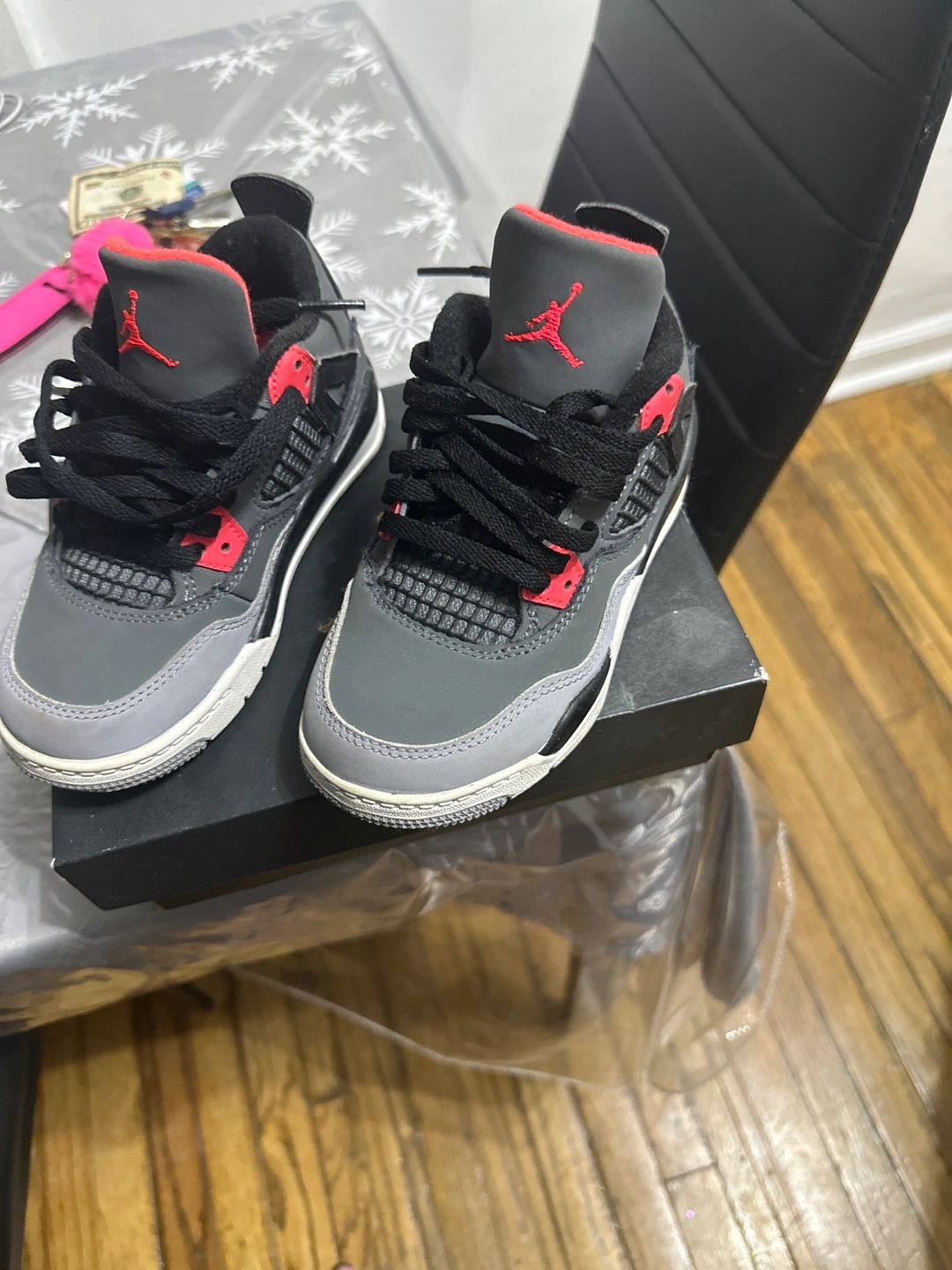 Sneakers with gray, black, and pink accents. Laces, tongue, and collar. The shoes are sitting atop a black shoe box. Size 11c for toddler
