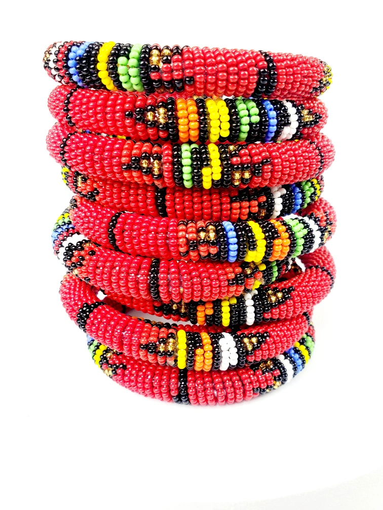 Hand-beaded, stackable Kenyan bracelets in red. Each one testifies to magnificent pearl craftsmanship. These bracelets are the perfect addition to your jewelry collection. You can even wear them to create a colorful, vibrant ambiance.