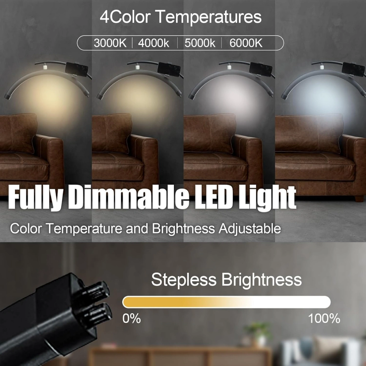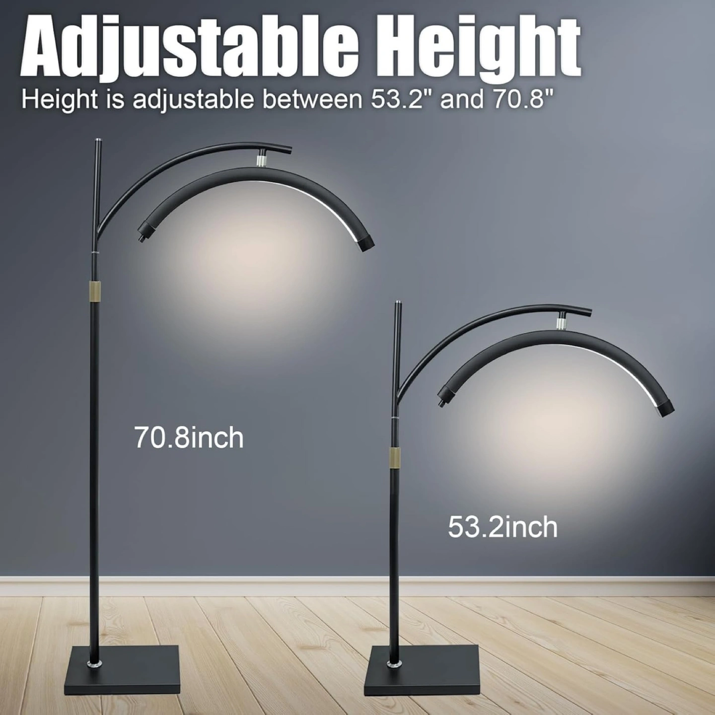 This is an arc-shaped LED floor lamp. Height is adjustable between 53.2" and 70.8". It has fully dimmable LED light. This floor lamp is perfect for creating a relaxing atmosphere in your home.
