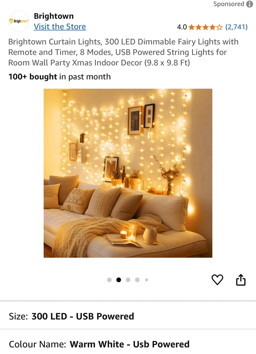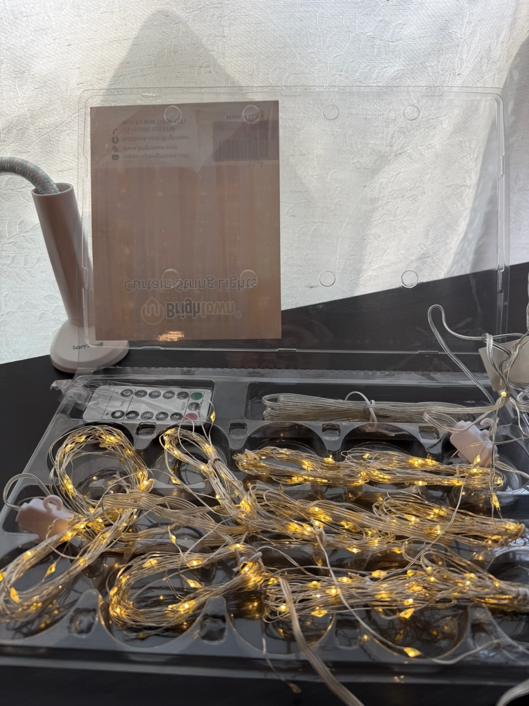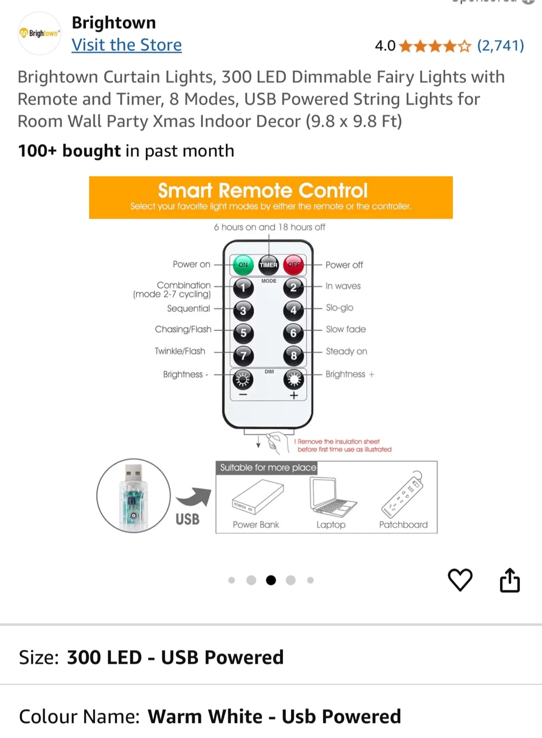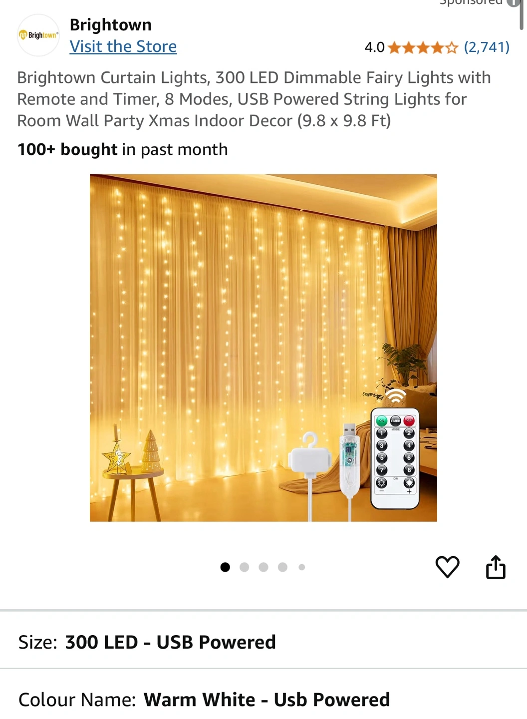 Brightown Curtain Lights, featuring 300 LED dimmable fairy lights with remote and timer, offer 8 modes and are USB powered, perfect as string lights for room wall party Xmas indoor decor (9.8 x 9.8 Ft). These lights are new, providing a warm white glow to any space.