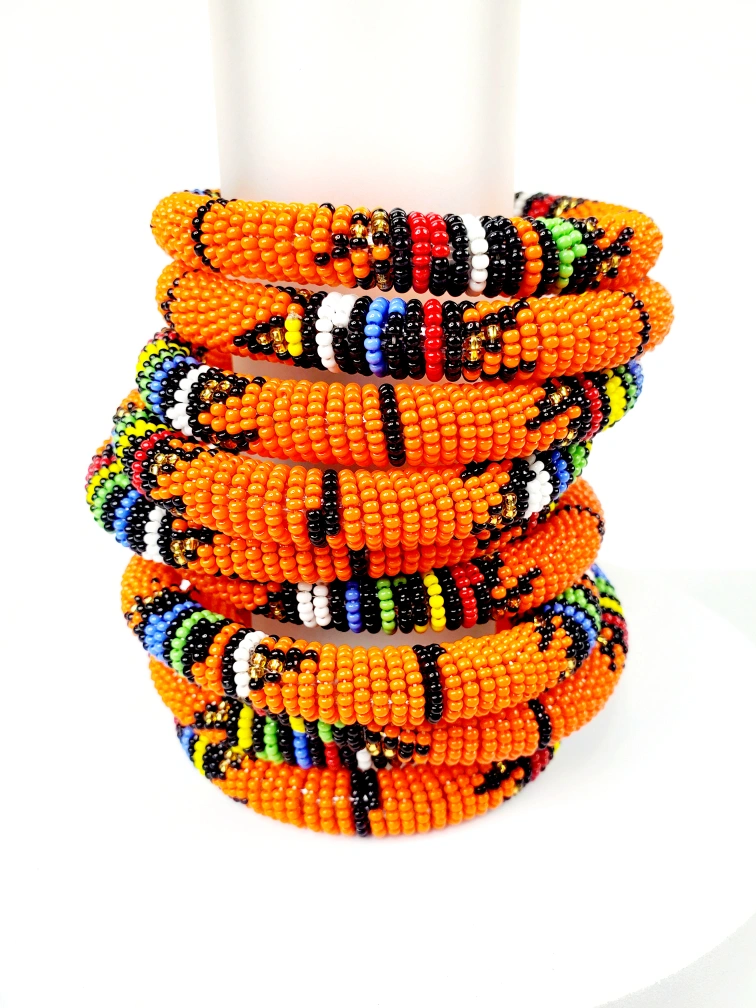 Hand-beaded, stackable Kenyan bracelets in orange. Each one testifies to magnificent pearl craftsmanship. These bracelets are the perfect addition to your jewelry collection. You can even wear them to create a colorful, vibrant ambiance.