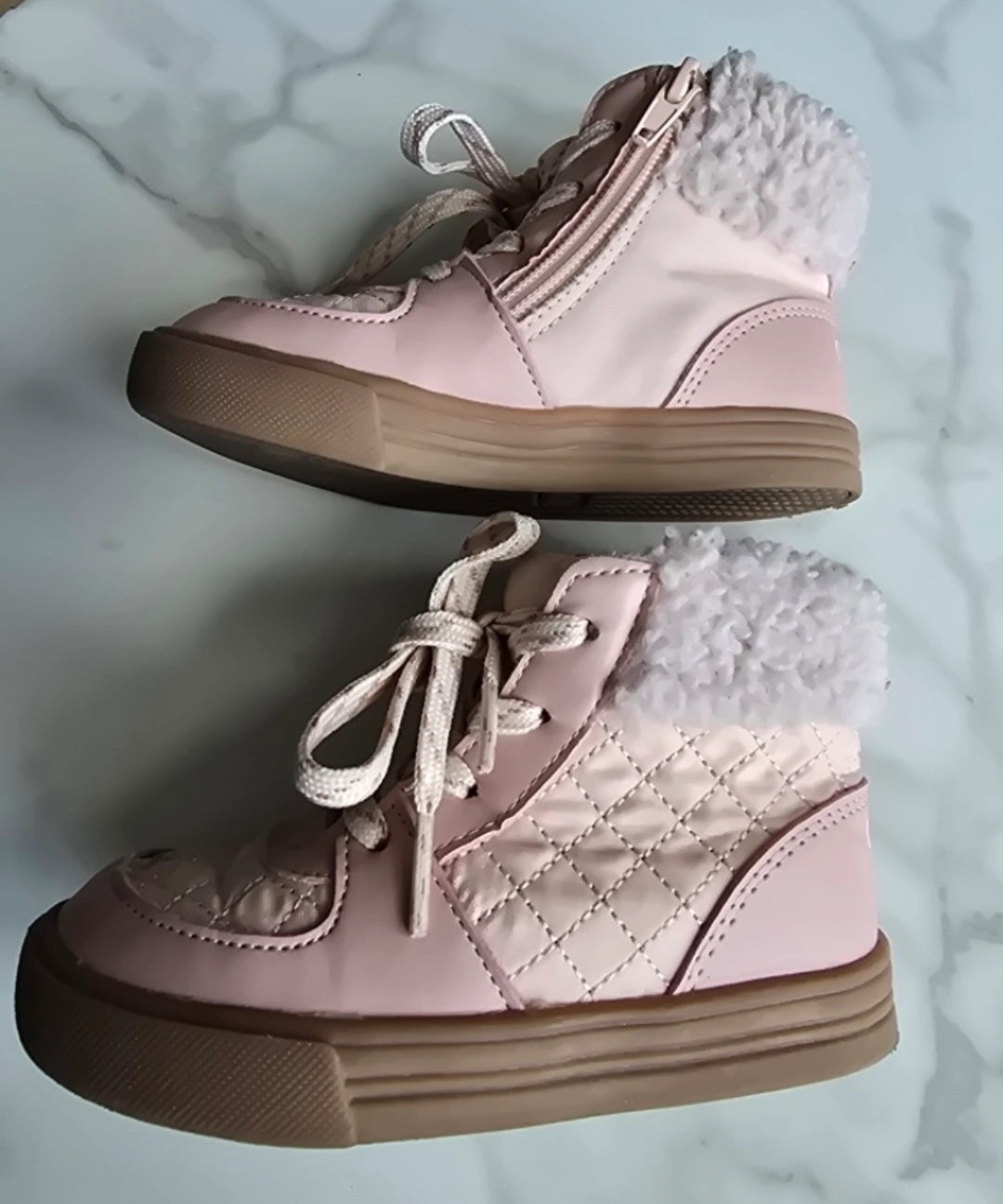 Pretty pink high-top sneakers. Features a zipper. Has lace-up closure. These shoes would be excellent for your little one to wear on a relaxing stroll around the park.