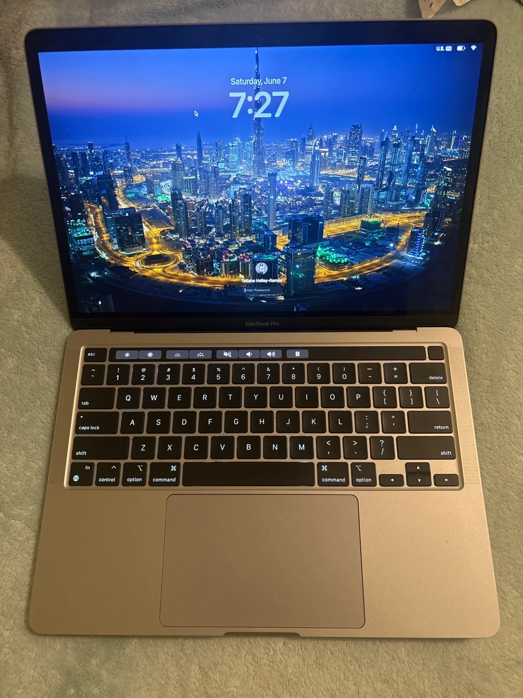 Laptop with a silver finish. The screen displays a colorful city scene. The keyboard features black keys with white lettering & touch screen bar. Enjoy this laptop while working on a project or streaming your favorite show.