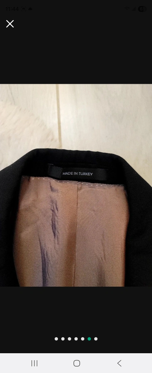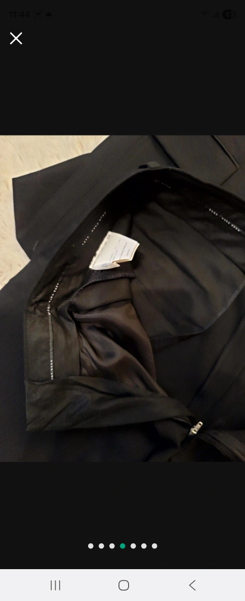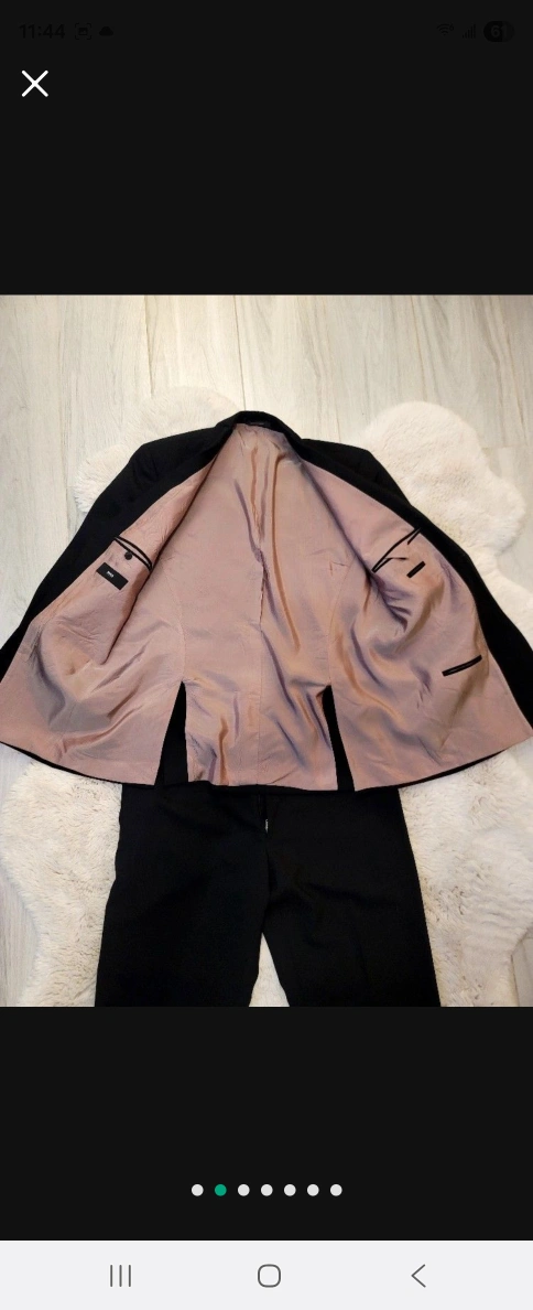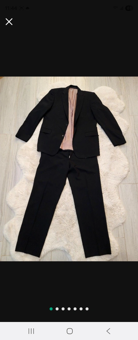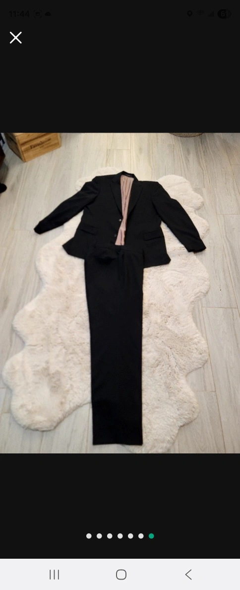 A sharp, black suit, perfect for a formal occasion. The suit jacket has a classic button closure and the trousers are straight-legged. I am sure you will love this suit, and feel more confident in yourself while wearing it. Size 42R