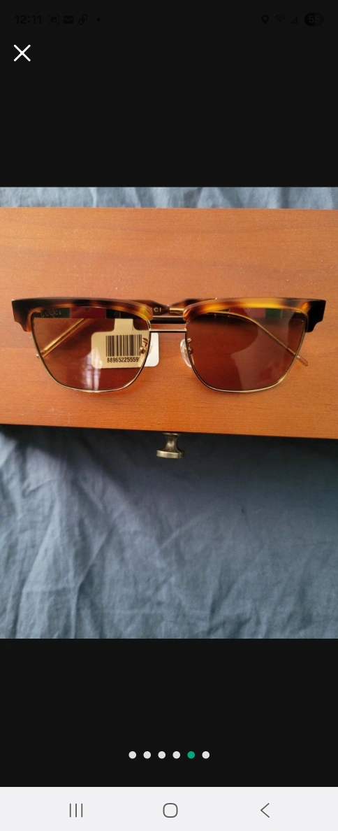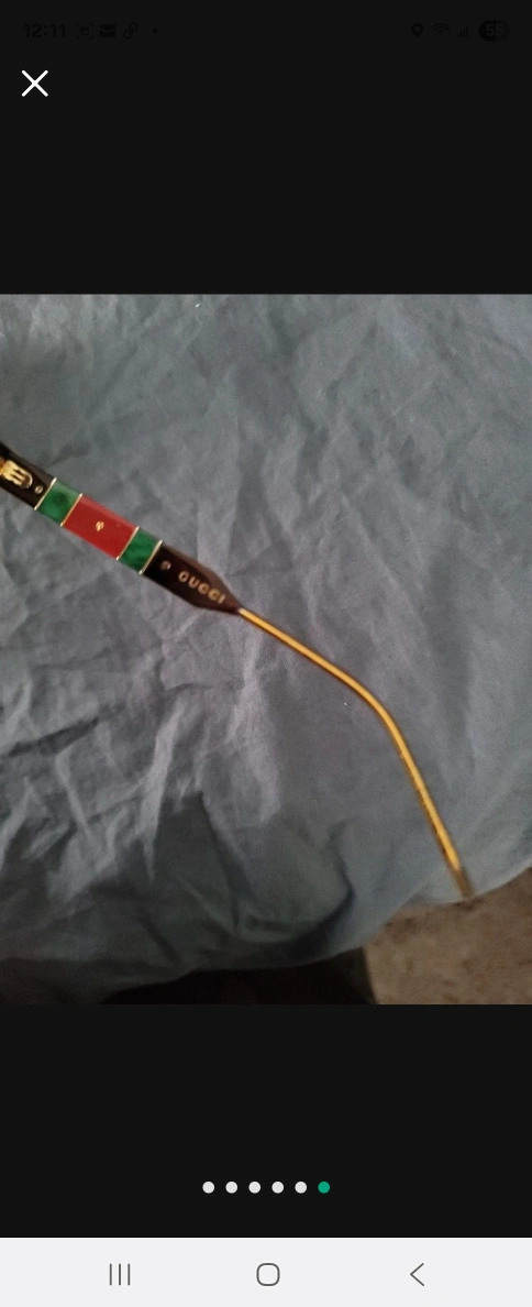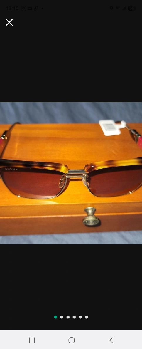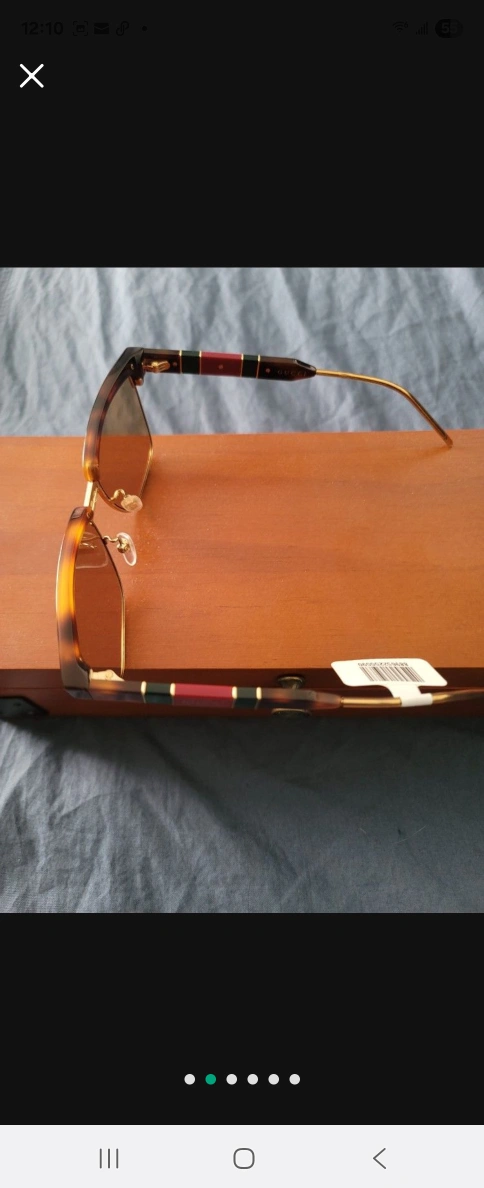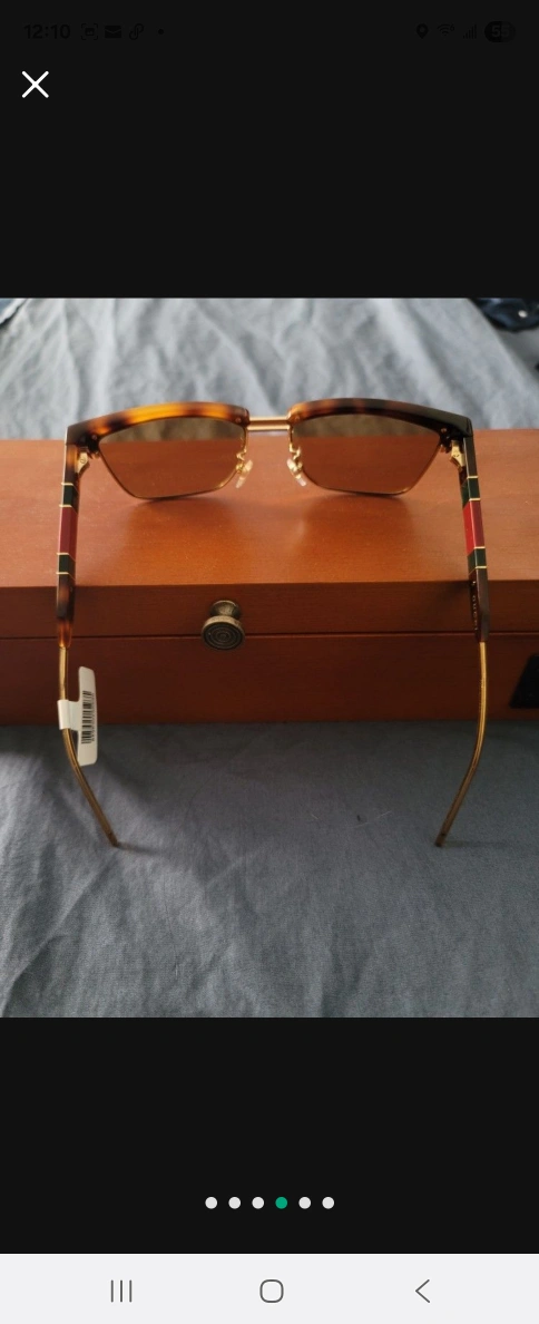 Beautiful pair of sunglasses. The frames are a mix of tortoiseshell and gold, with the iconic red and green Gucci stripes on the arms. Perfect for a relaxing walk in the park.