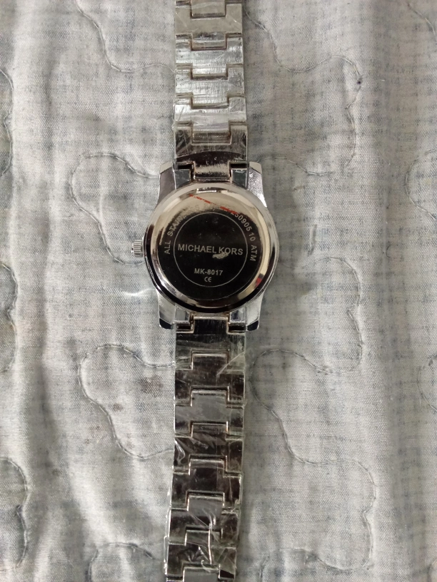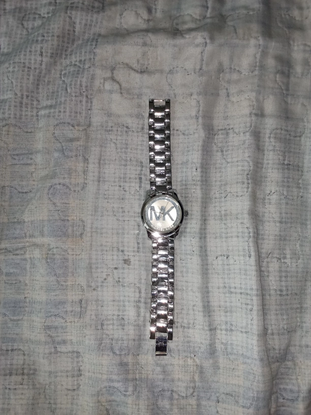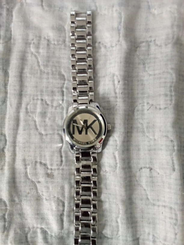 A stylish watch with a silver band. The watch face displays the iconic MK logo. Wearing a watch is a great way to keep track of time in a peaceful manner.