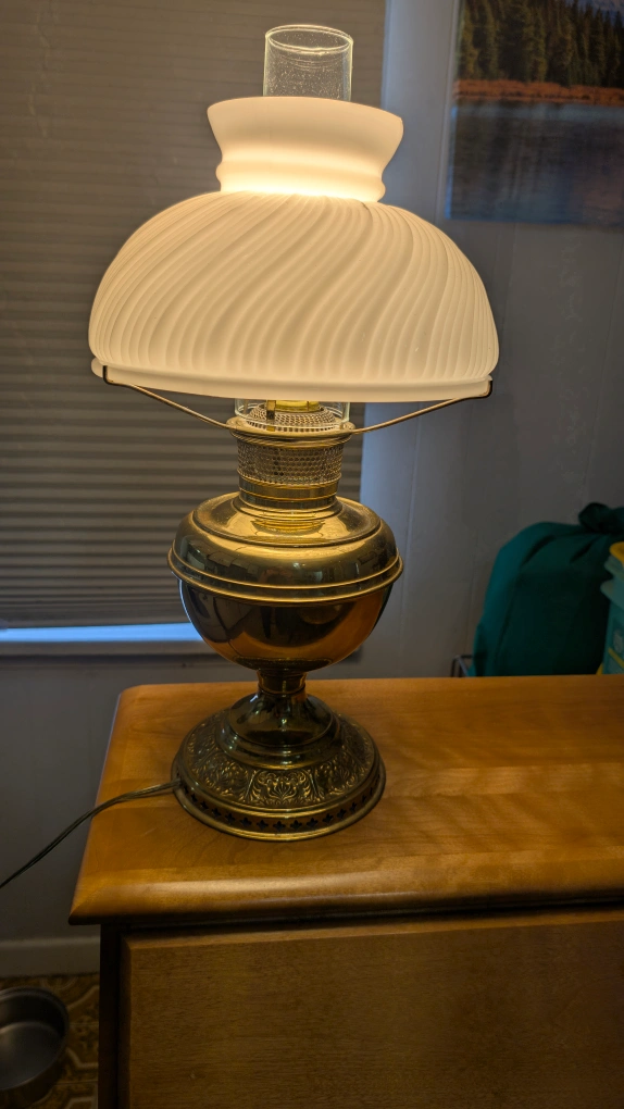 Brass lamp with a frosted white glass shade. The shade features a swirling design. Base with ornate details. A lovely addition to any room, helping create a peaceful atmosphere.