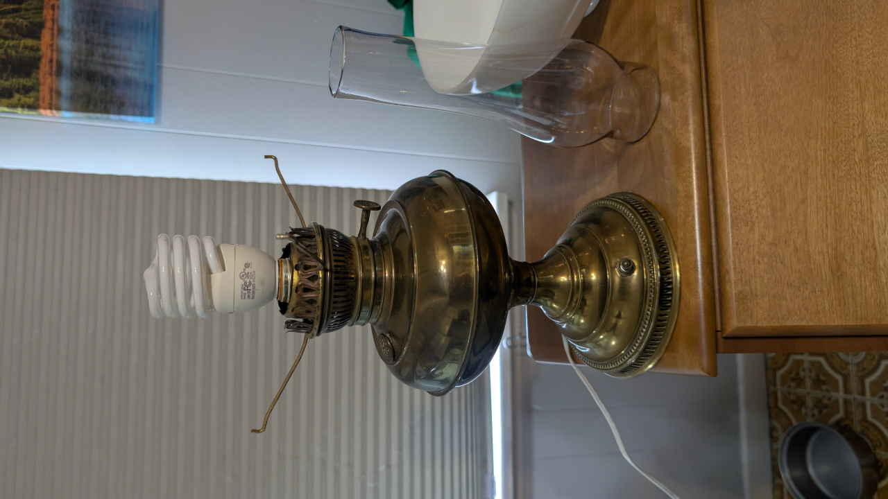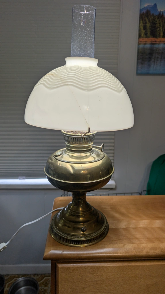 An antique brass lamp. It features a decorative base and a glass shade. It would be a lovely addition to any room, creating a warm ambiance.
