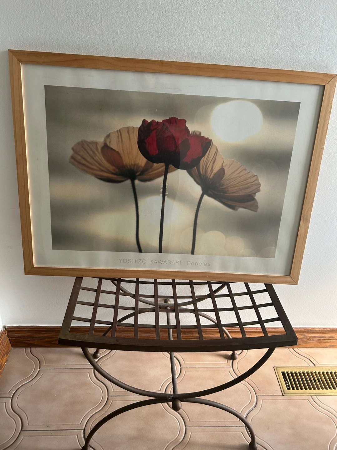 The beautiful art print features poppies in a calming scene. It is a framed piece with a wood finish. A perfect addition to add some tranquility to your space.