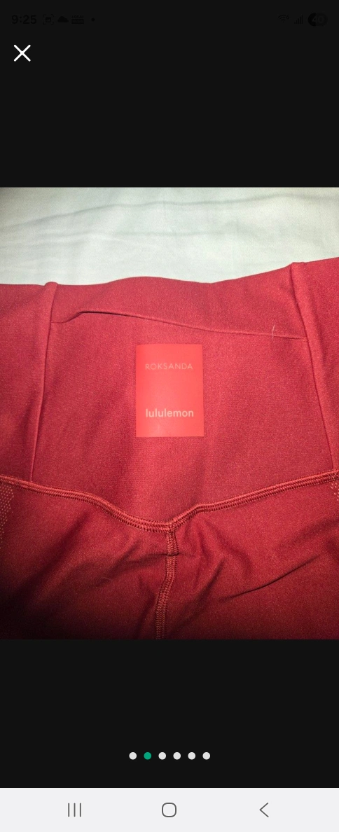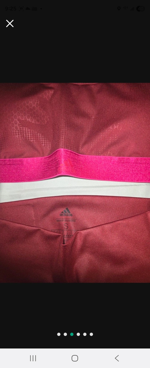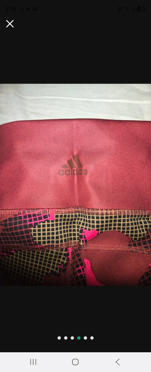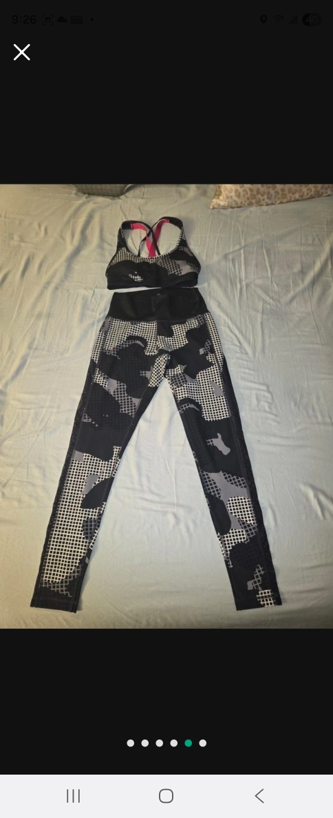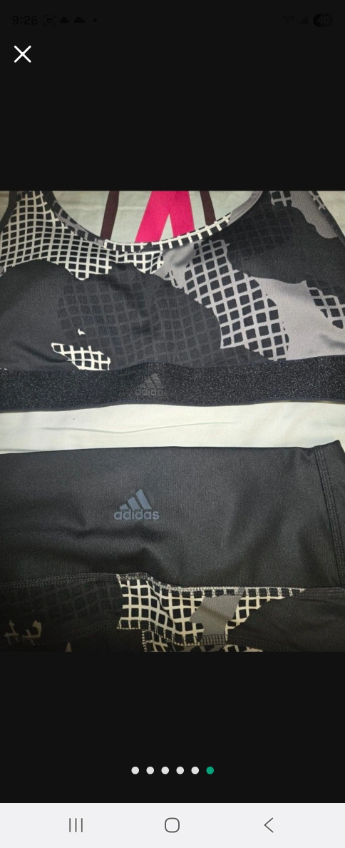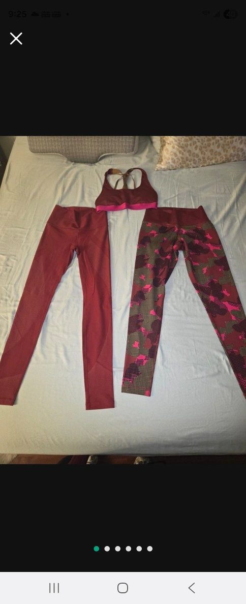 Matching set, great for your next workout or a peaceful day in. The leggings and bra set have dark tones, with a mixture of patterns and designs. The first set of leggings is red with the Adidas logo on the waistband. The second set of leggings and bra is red and black with the Lululemon tag.