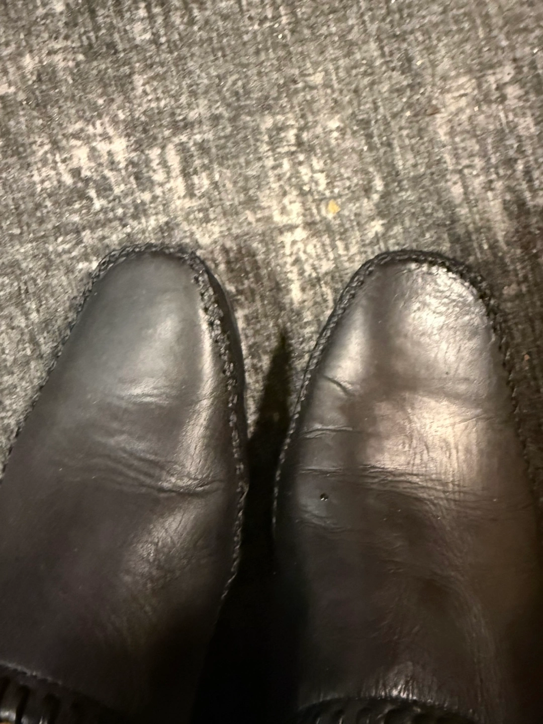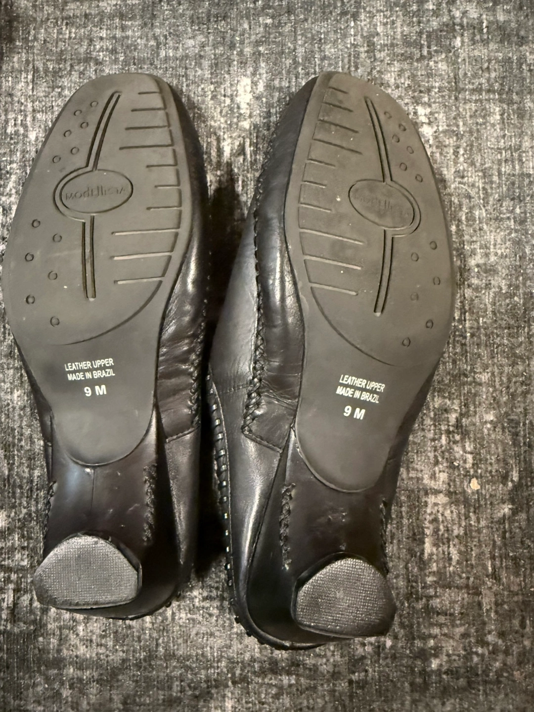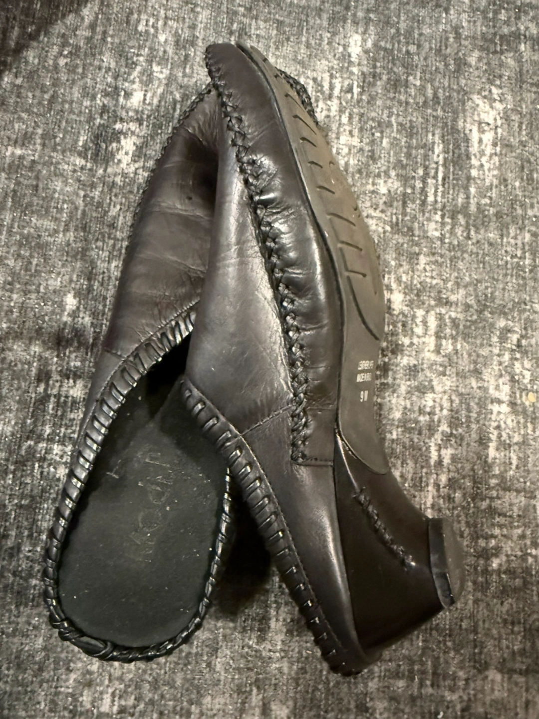 A pair of black loafers. Made of leather. Featuring stitched detailing around the edges and on top. The soles show a small heel. They are a perfect choice for a relaxing walk in the park.
