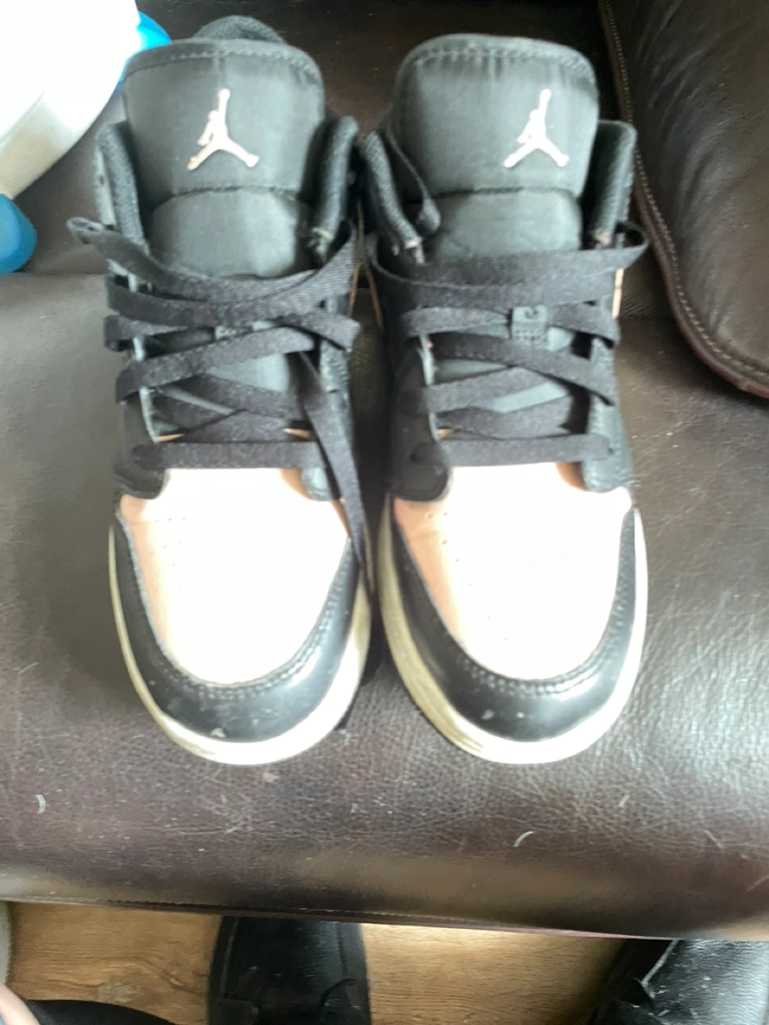 75The shoes present a black, peach and white color scheme. The design features a combination of leather and a rubber sole. These sneakers can be a nice touch for your style.