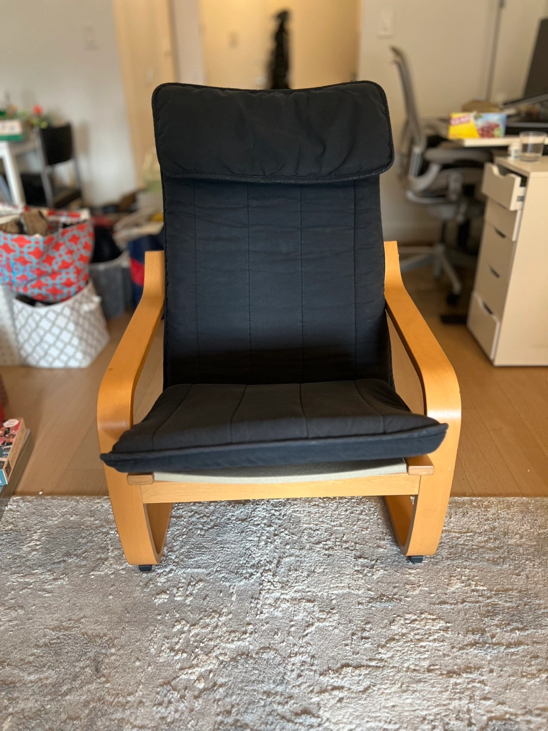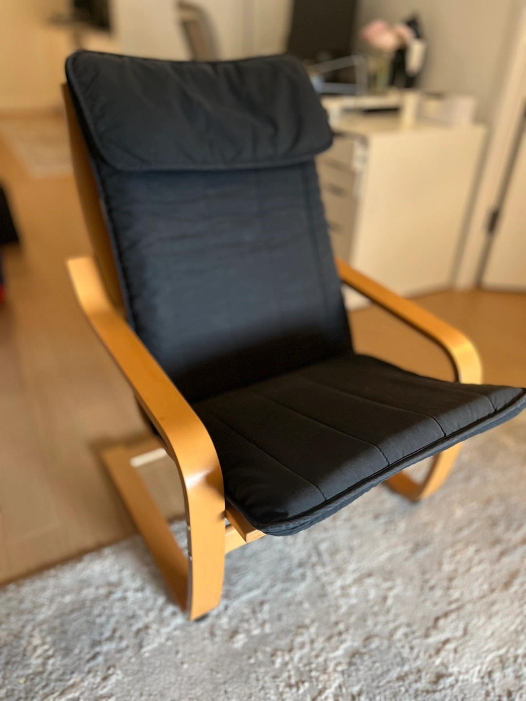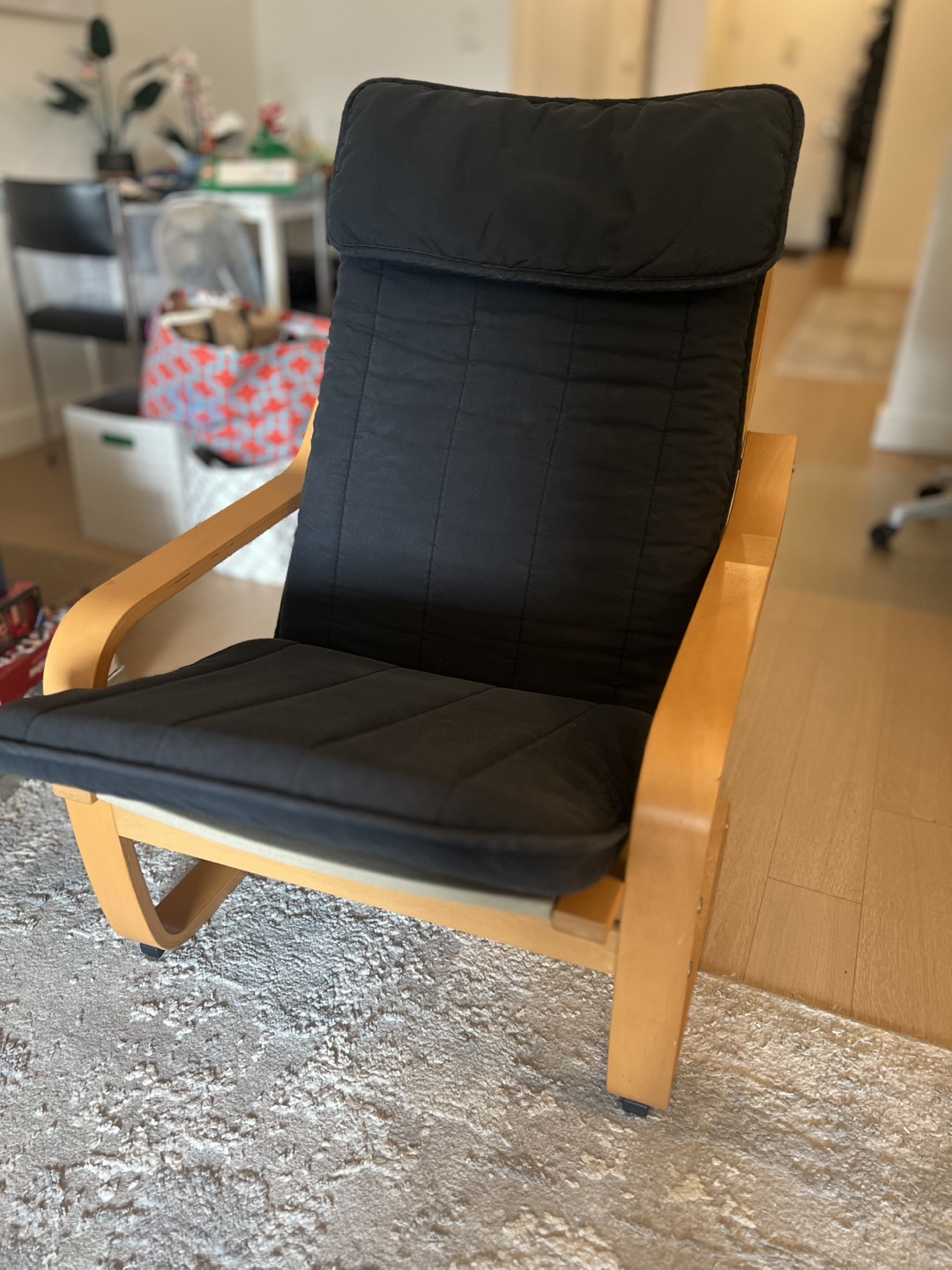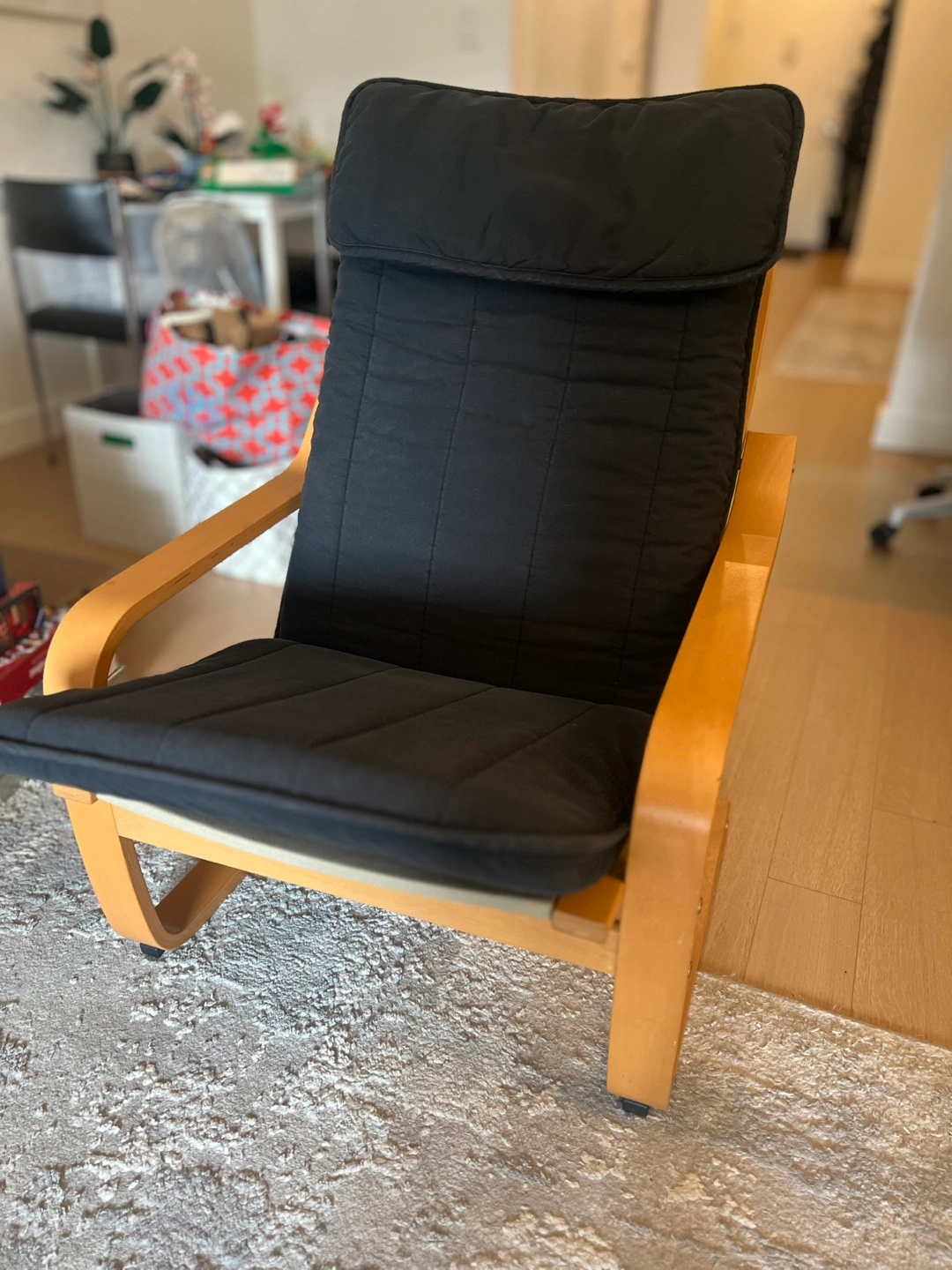 Wooden frame IKEA POANG chair. Has black cushions for the seat and back. Perfect for relaxing after a long day.