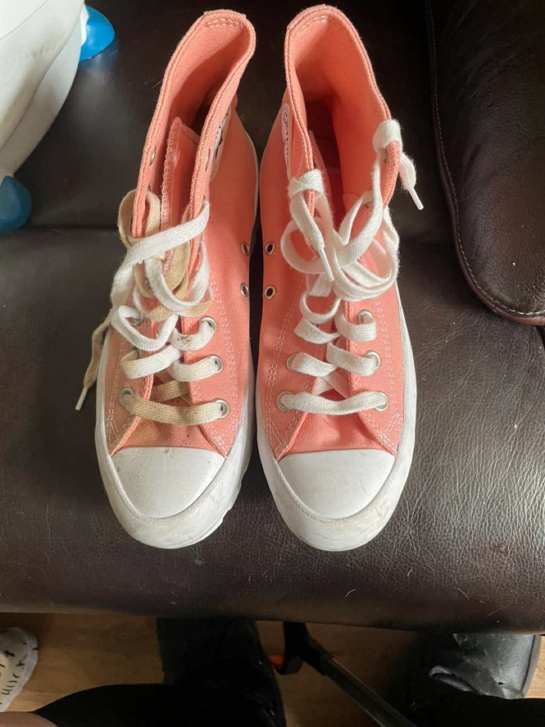 75High-top sneakers. Pink uppers with white laces and rubber soles. White platform sole. Pair of shoes, perfect for everyday wear, or a casual outing.