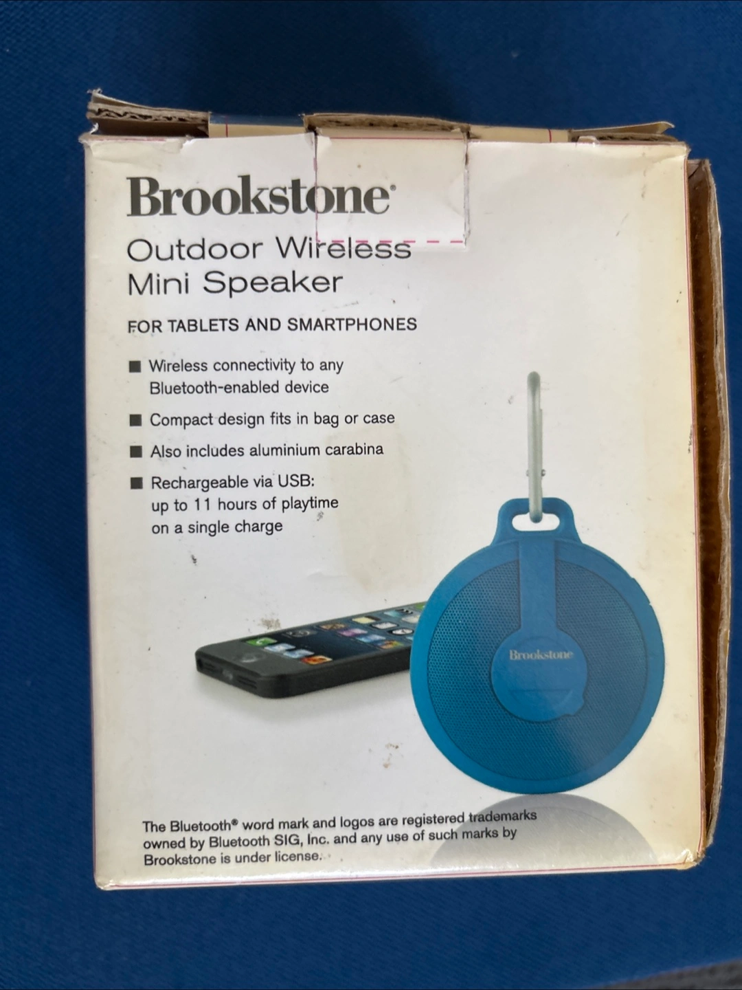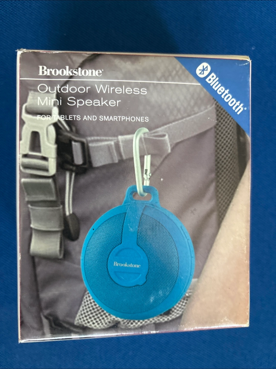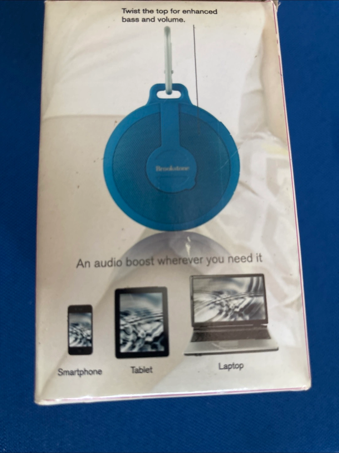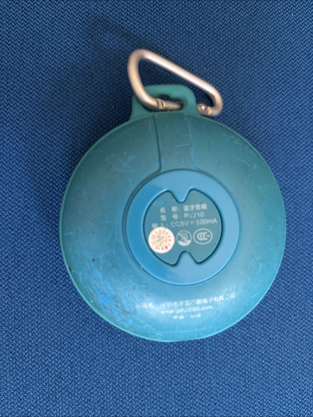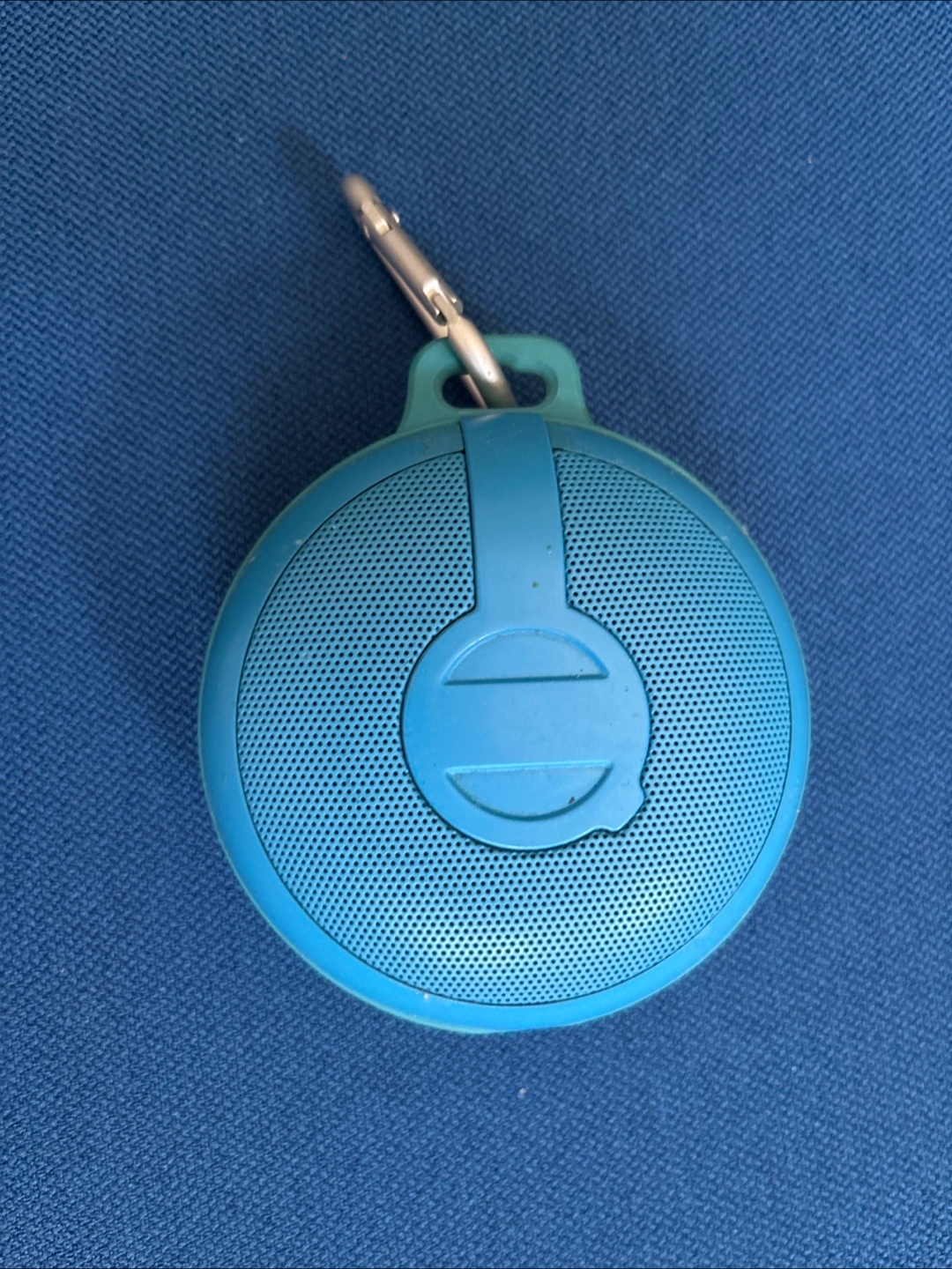 A small, round speaker with a carabiner clip. Designed in a blue color. Comes with its original box. Listening to music with it can bring you great joy.