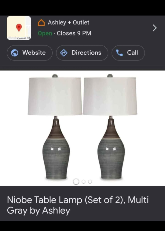 1 / 61 / 6Buy & Sell(2) Ashley Niobe Table Lamp Set(2) Ashley Niobe Table Lamp Set$75A beautiful set of two lamps. A lovely addition to a bedroom for a sense of peace at the end of the day. Each lamp has a ceramic base and a lamp shade.ConditionNewWHERE TO MEET83rd and PulaskiView MapSELLERverifiedCJ DEALsAshburn1268 reviews0 chats·3 favorites·82 viewsSEND CHAT TO SELLERHi CJ DEALs! I’m interested in your listing.Hi CJ DEALs! I’m interested in your listing.Get the Karrot app to chatSign In to chat