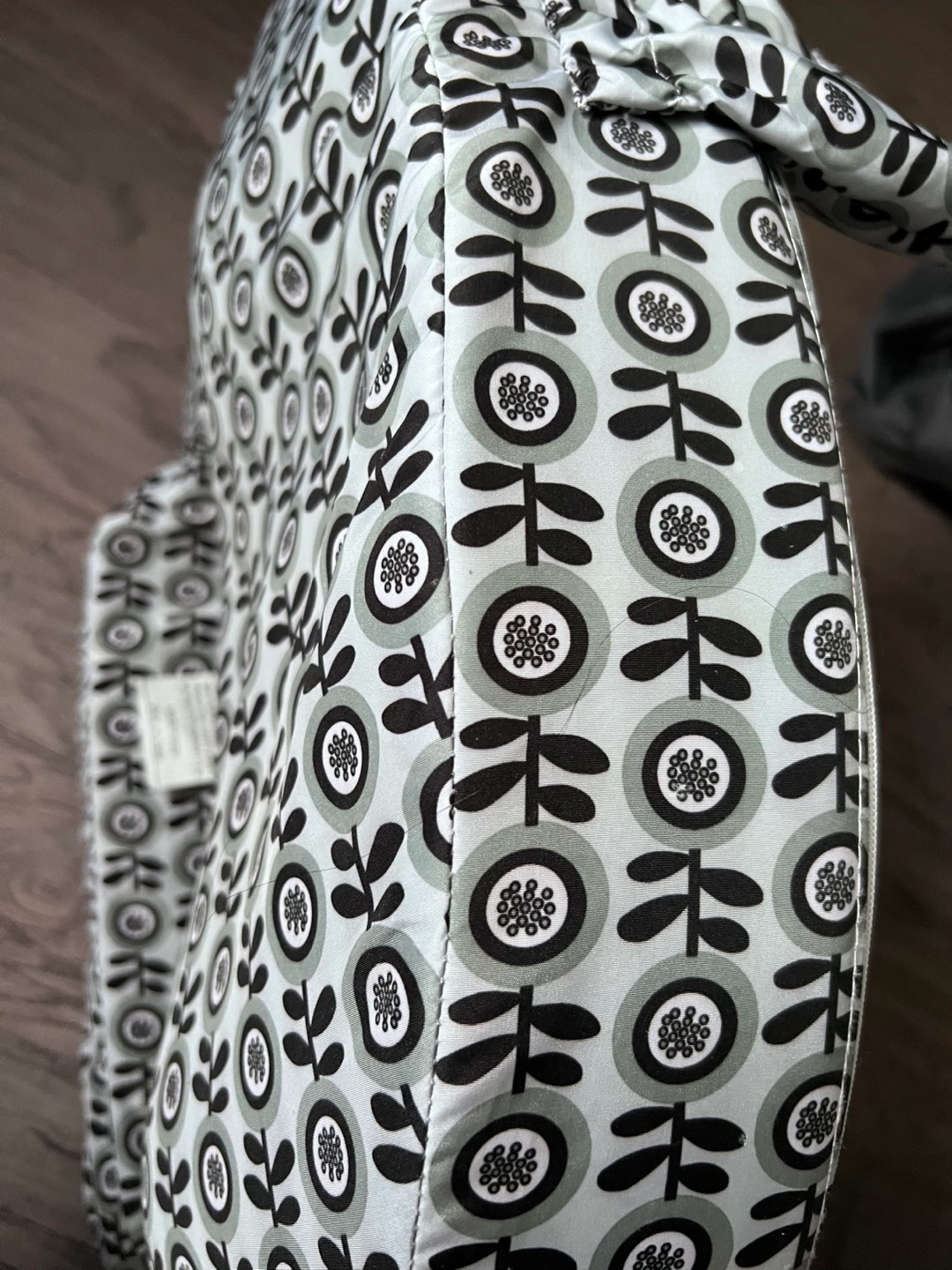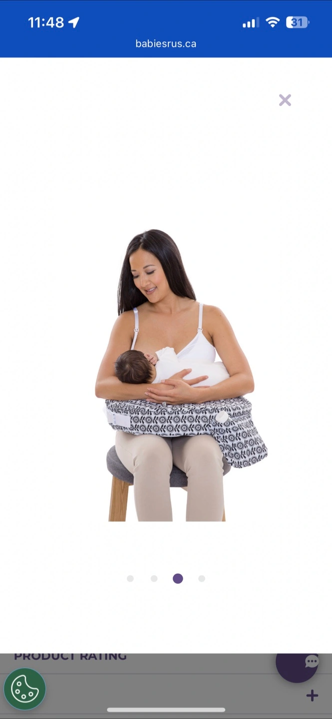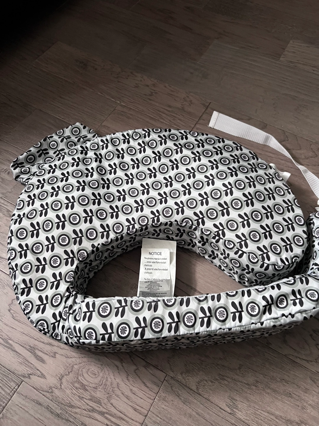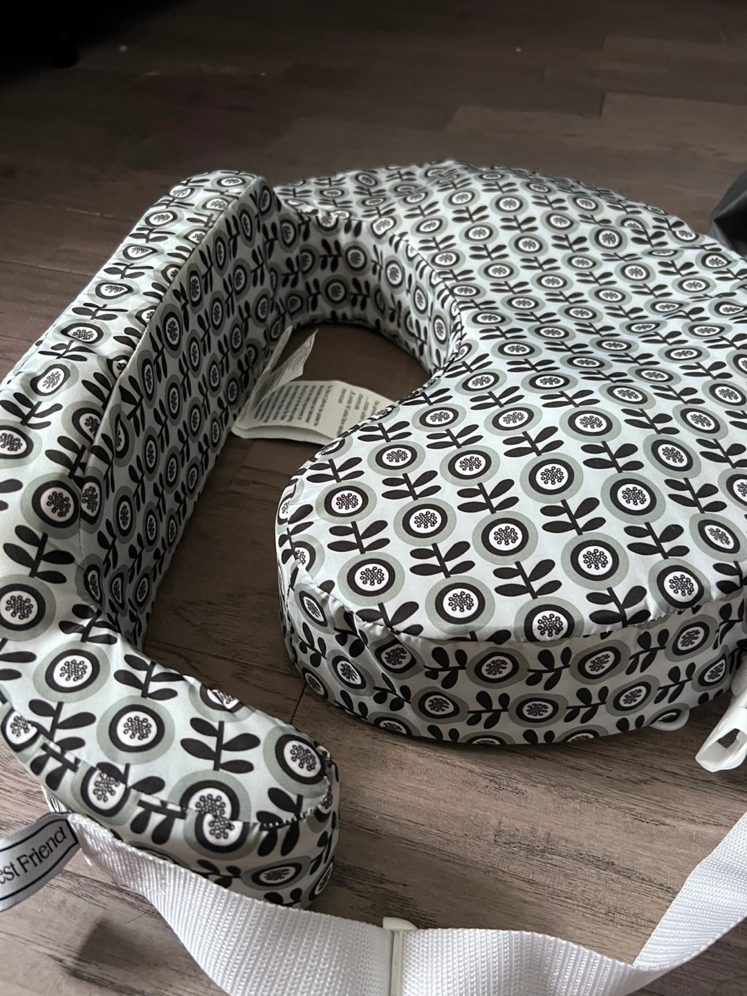 Nursing pillow with a decorative pattern. Designed to be worn around the waist, supporting the baby during feeding time. Providing a comfy setting while nursing can make the whole experience more enjoyable for you both.