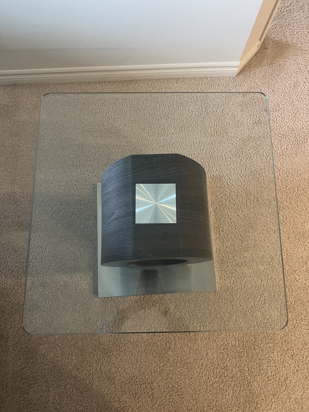 Beautiful coffee table. Features a clear glass top. Unique base made with wood and metal details. The ideal spot to place your favourite cup of tea while relaxing.