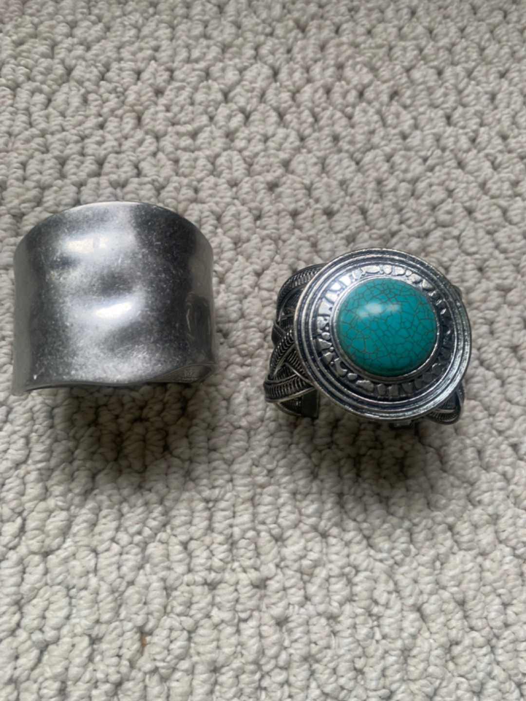 Two silver-toned bracelets. One of the bracelets features a cuff and a large turquoise-coloured stone. One bracelet has a hinged closure