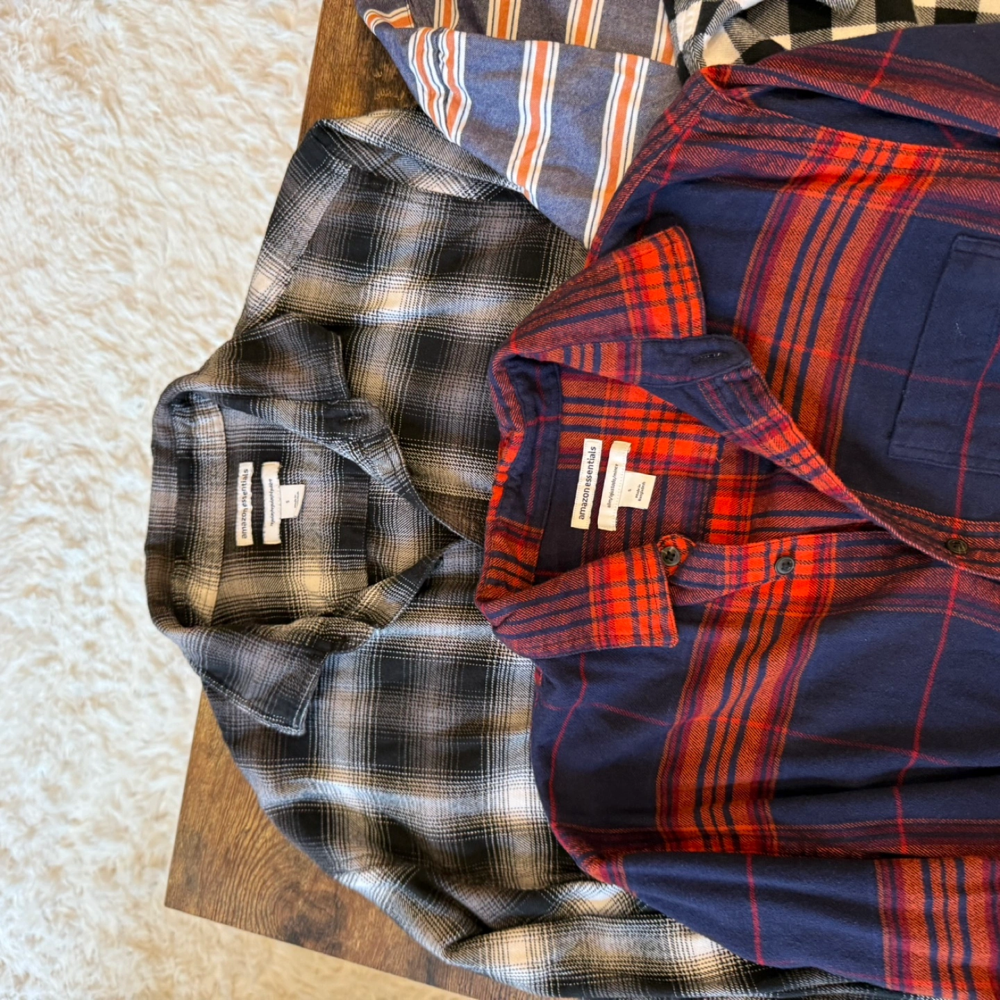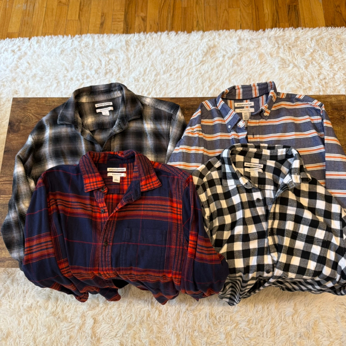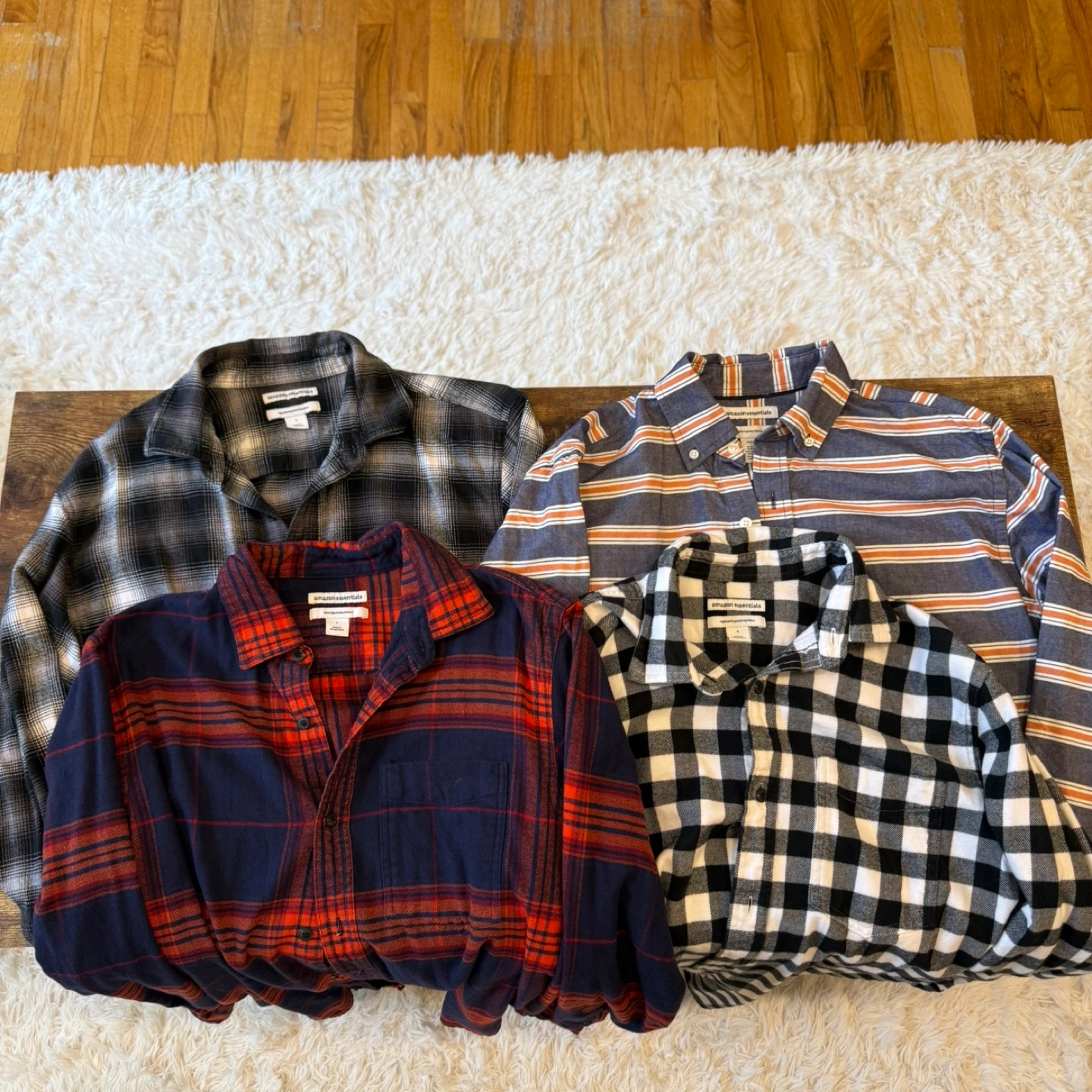 Four flannel shirts in various plaid patterns and colors. Long sleeves with button closures.