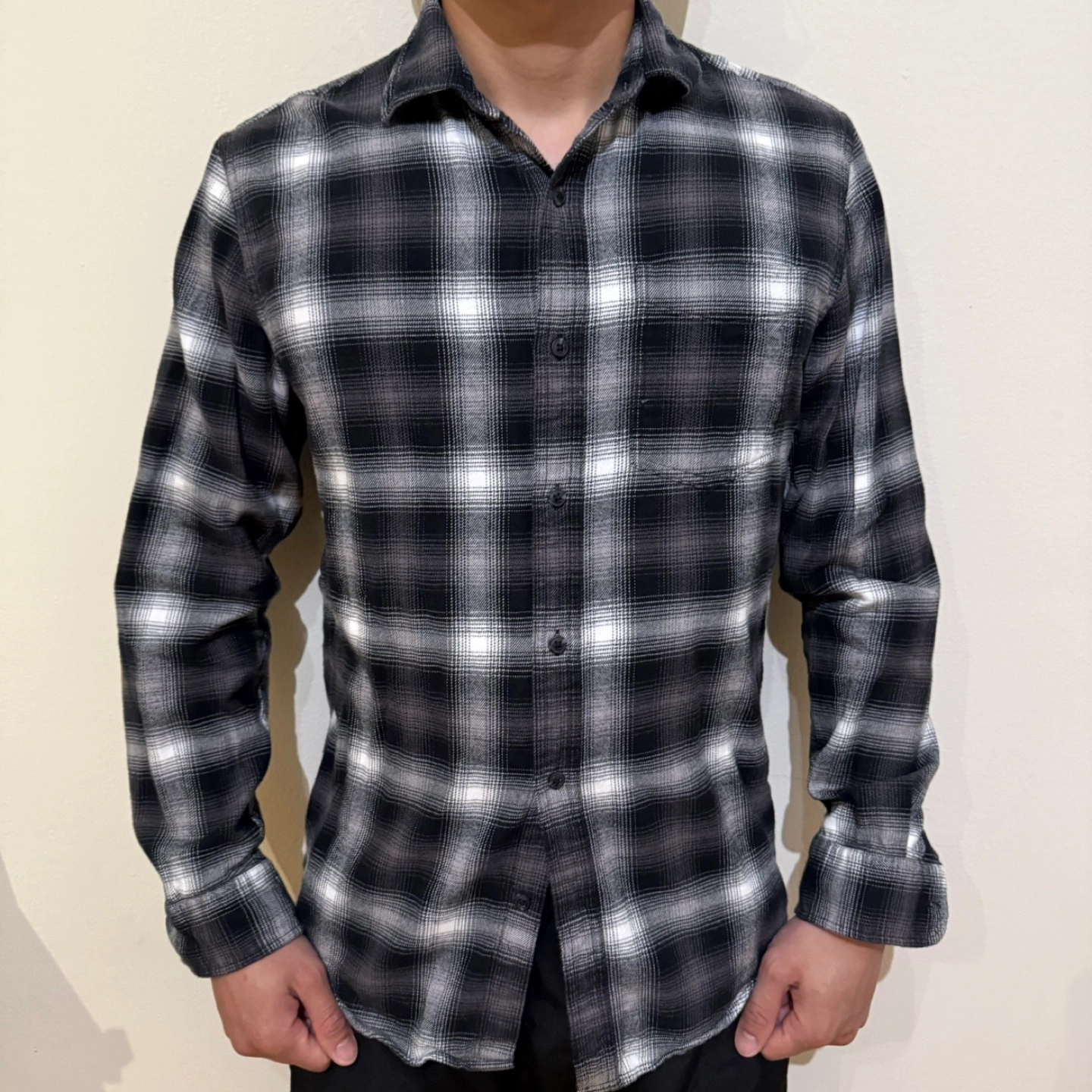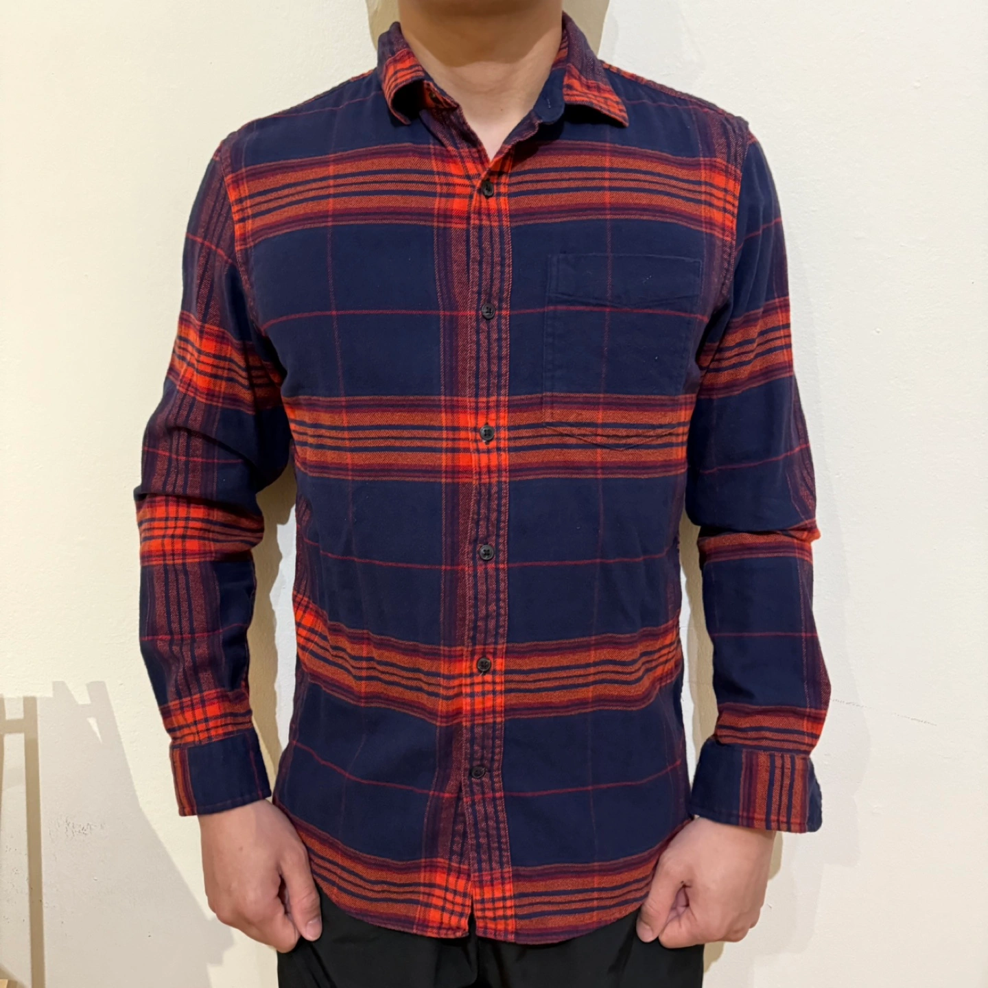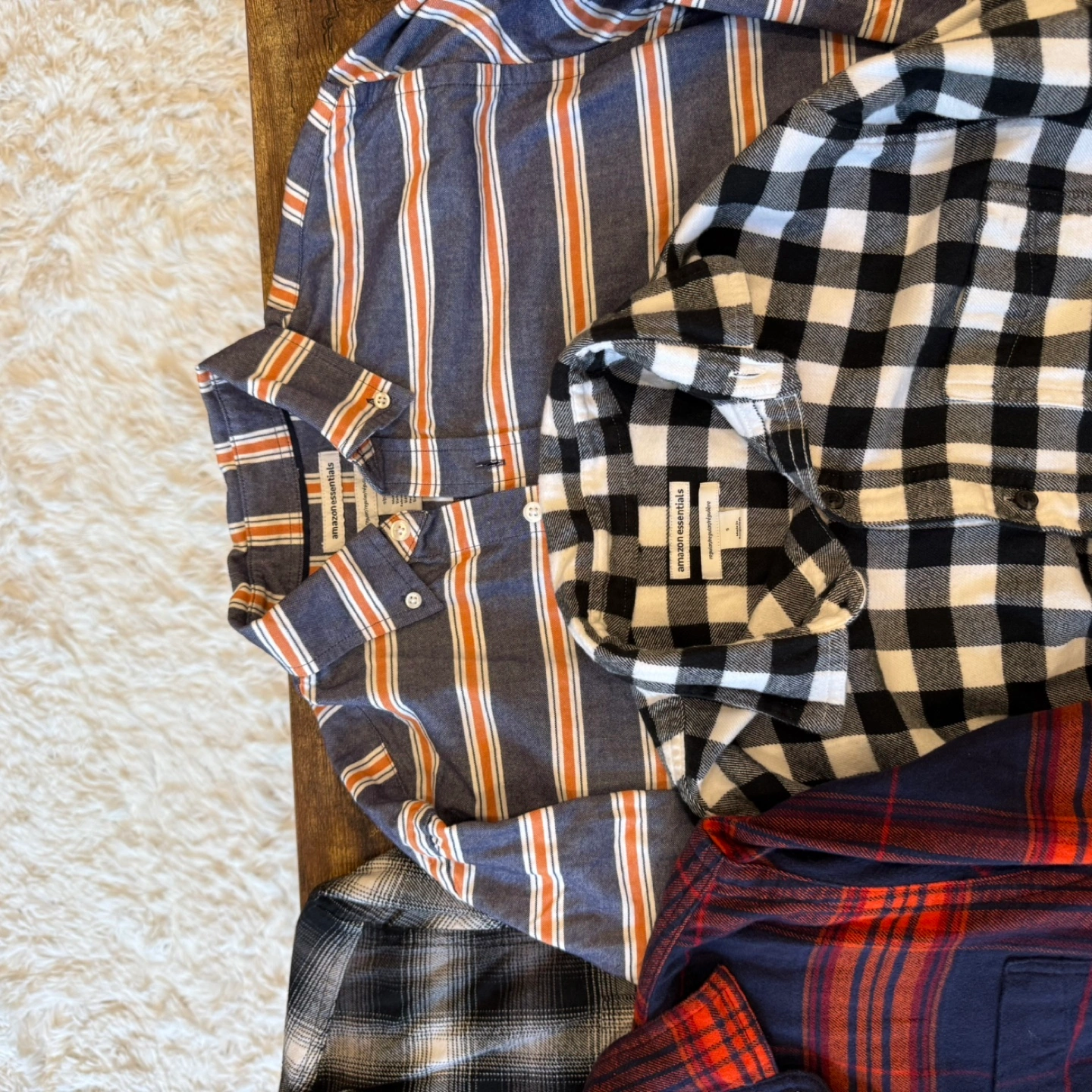 Four flannel shirts in various plaid patterns and colors. Long sleeves with button closures.