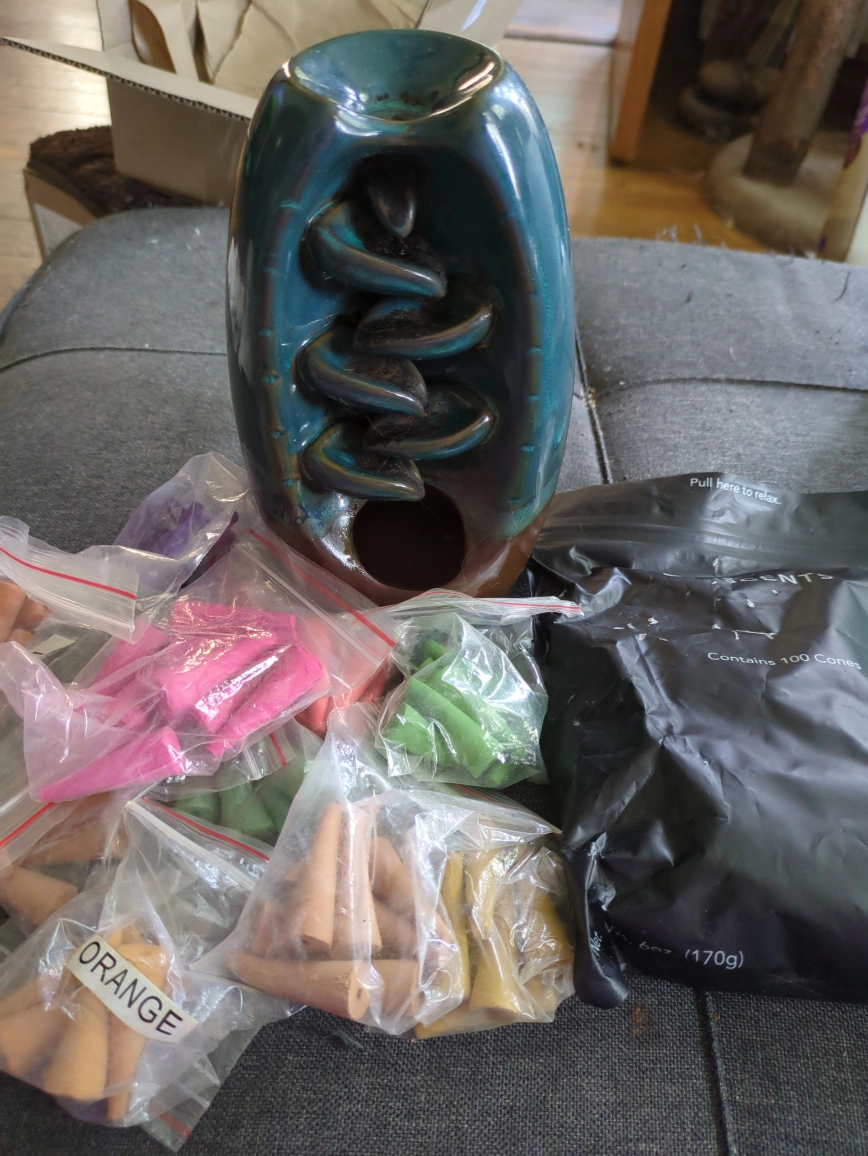 I am selling an insence cone set with a beautiful backflow burner. The backflow burner has an elegant blue and brown design. It will help you create a relaxing environment.