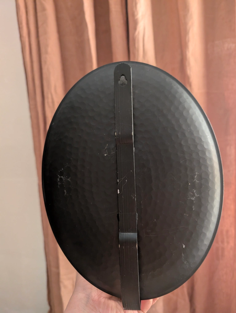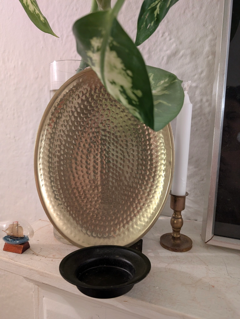 A beautiful gold, hammered metal tray with a black, round dish. The hammered metal tray has a subtle, elegant design. The black dish is made of metal and could be a great way to relax with your favorite candles.