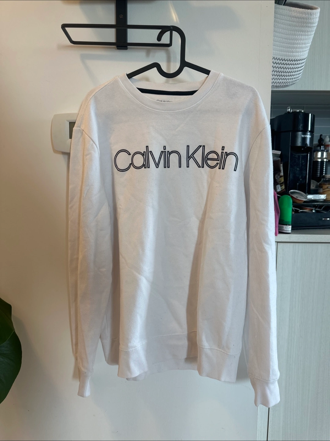 A white sweatshirt. Features a crew neck, long sleeves, and a ribbed hem and cuffs. The Calvin Klein logo displayed on the front. You will find it's perfect for cozy nights in.