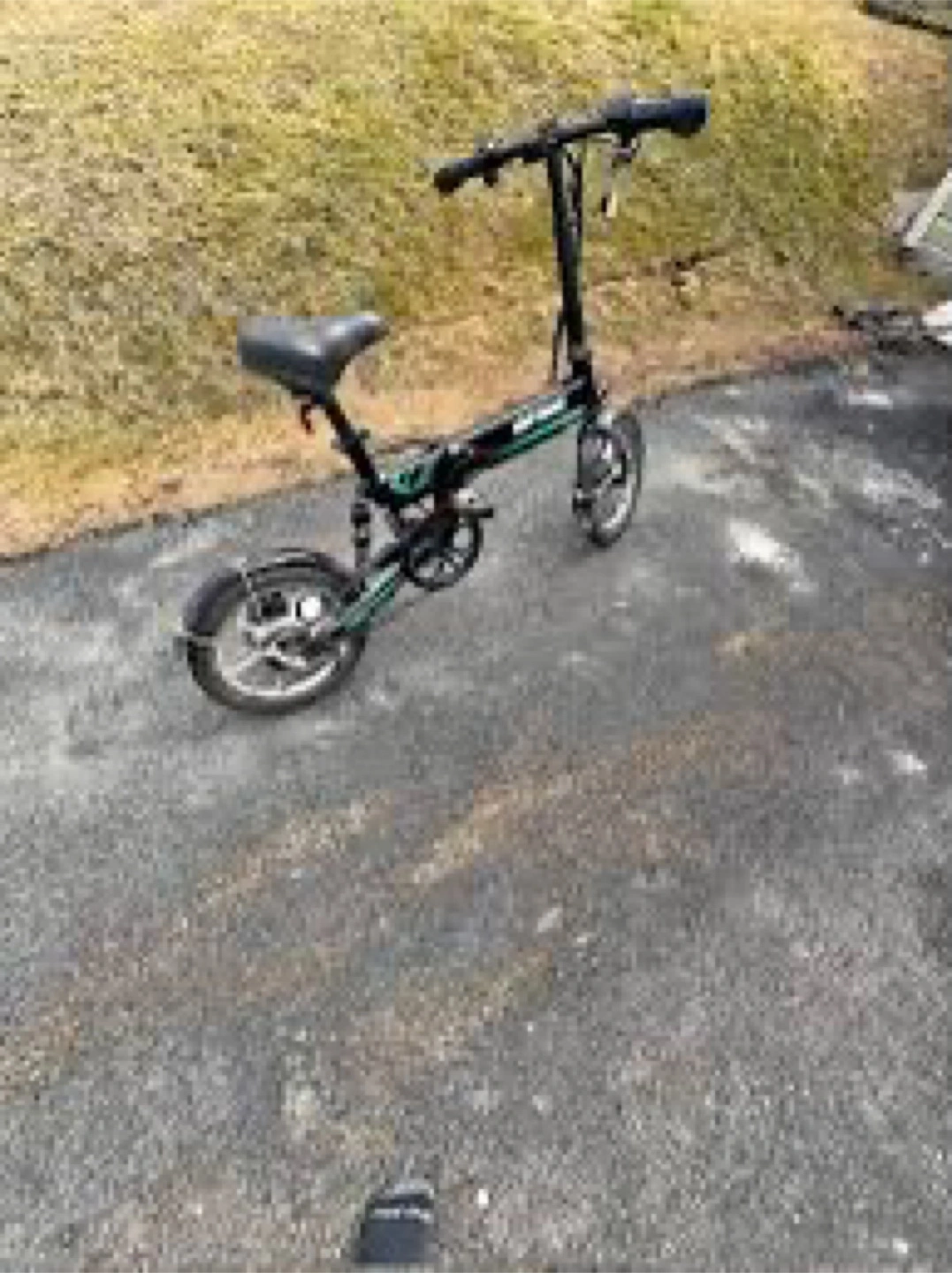 A folding electric bike, ready for your next adventure. It features a black frame with some green accents. Equipped with a seat, pedals, and front and rear lights. This bike is the perfect way to enjoy a relaxing ride around the neighbourhood.