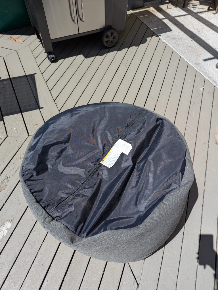 Round, grey beanbag chair. Features a sturdy material. Perfect for relaxing and enjoying a good book. Cleaned but not from a pet free home.