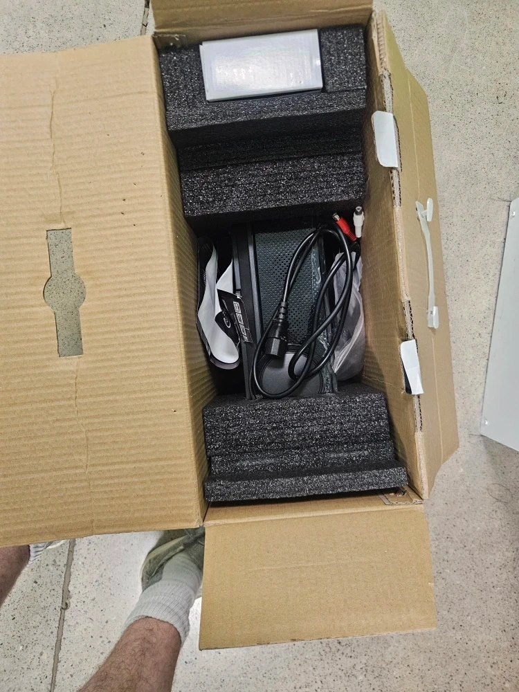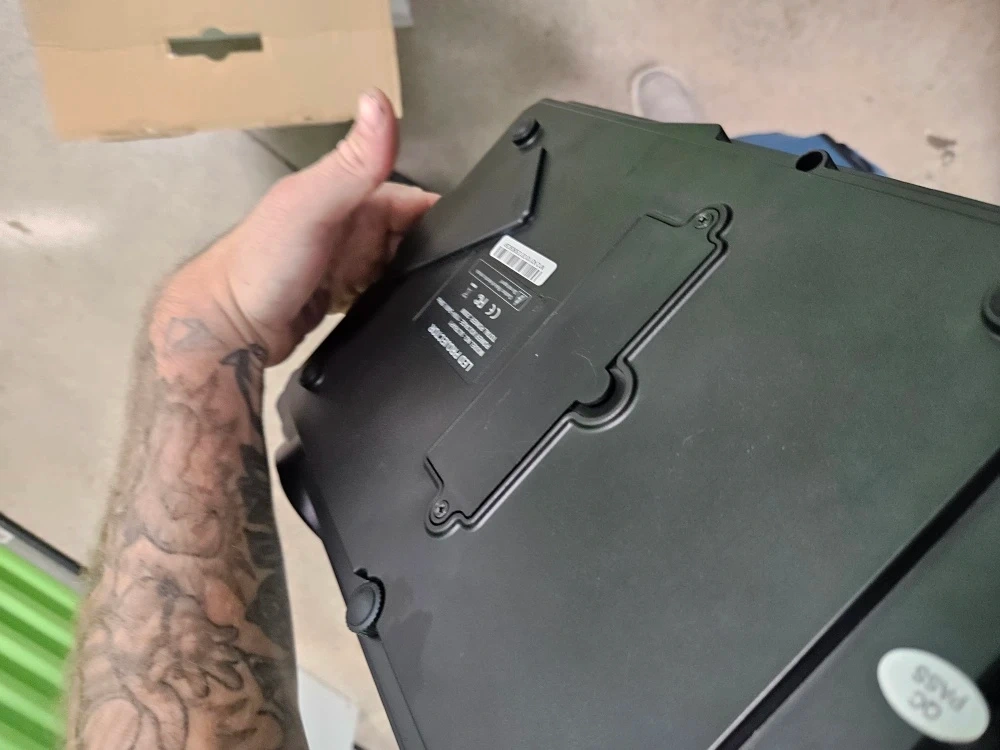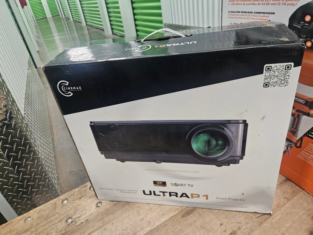 175. firm. The box features an image of a projector. There is a handle on top. The box advertises a 4K smart TV projector, perfect for movie nights.