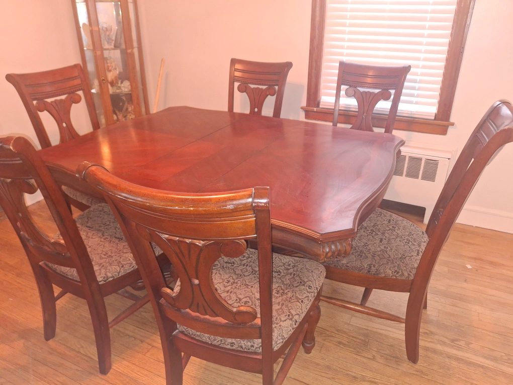 Beautiful wooden table with a rich finish. Featuring a set of matching chairs with patterned seats. Perfect for enjoying a home-cooked meal with loved ones.