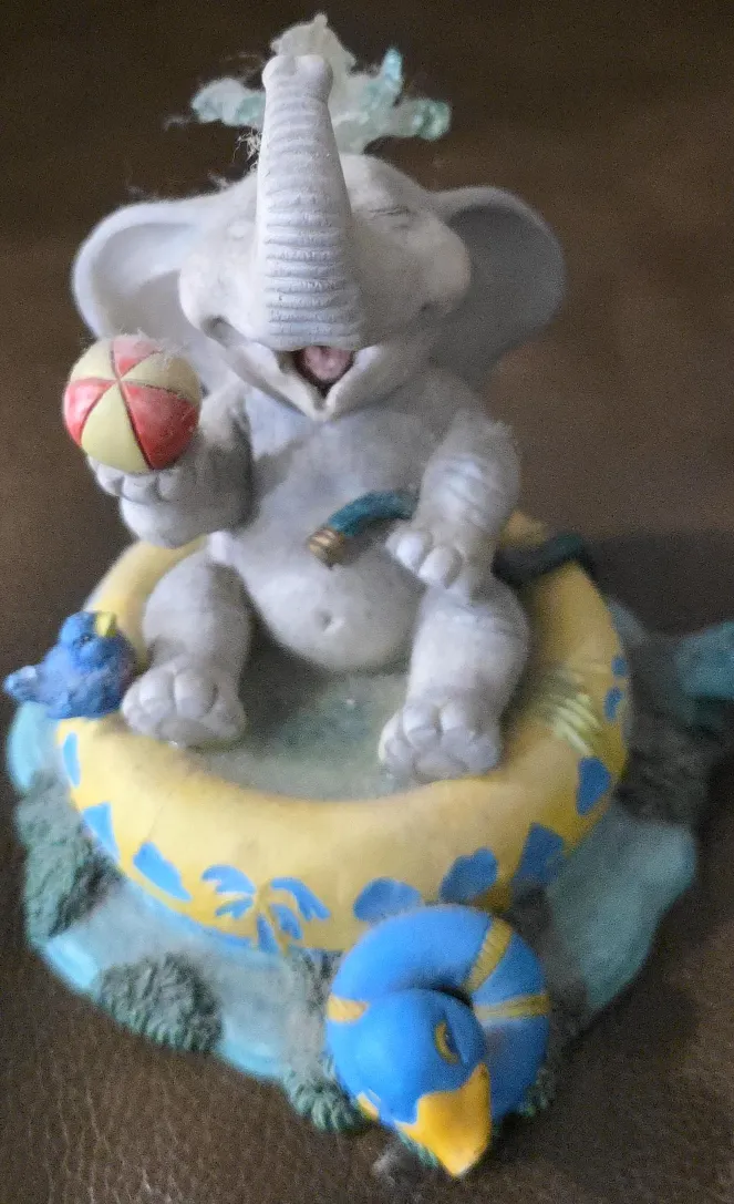 An adorable elephant figure. It is sitting in It is holding a ball. This figurine is perfect for adding a touch of whimsy to any space.