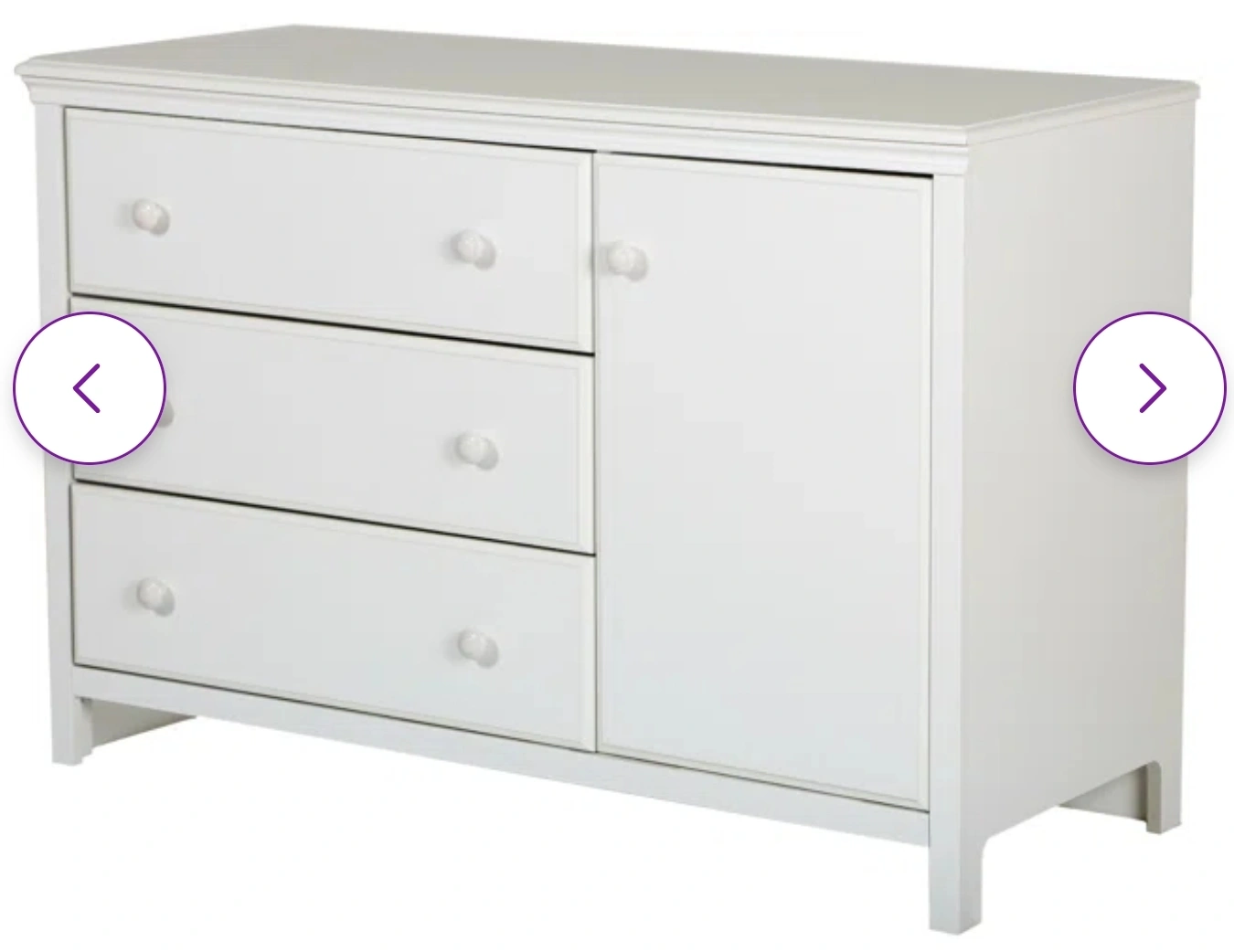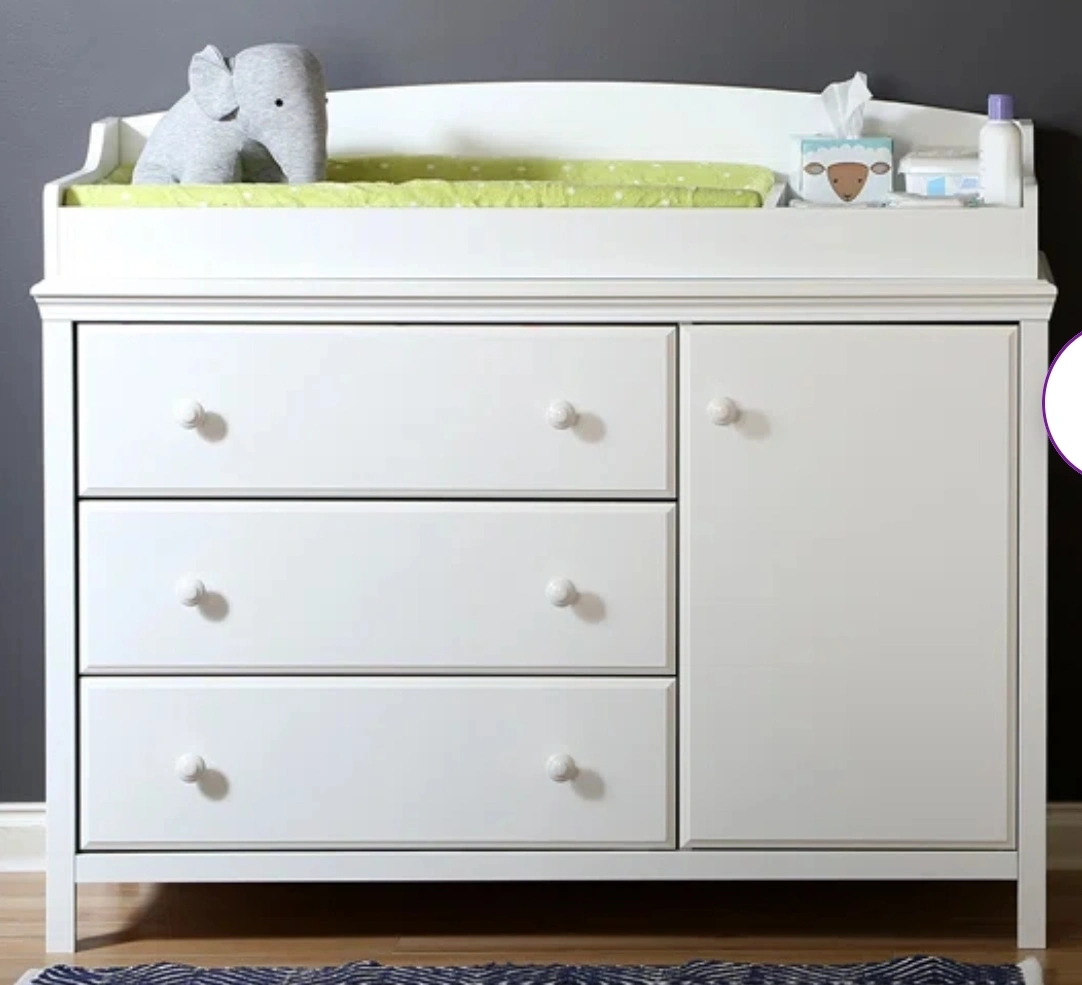 White changing table dresser. Features three drawers and a door. The changing area has a shelf. It is a perfect place to store items for your little one, providing peace of mind knowing everything is within reach.