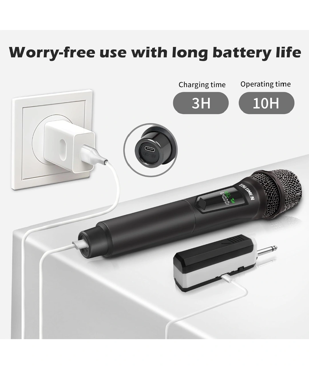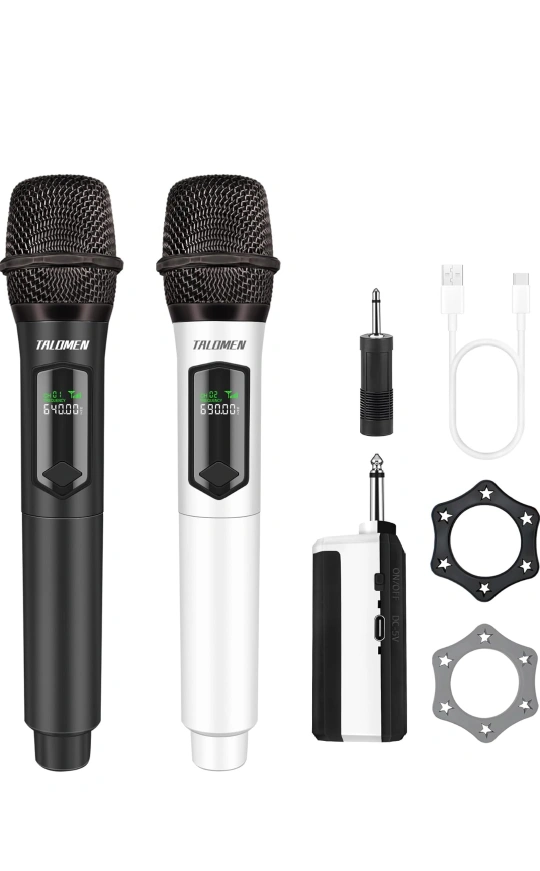 talomen Wireless Microphones, Rechargeable Karaoke Microphone for Singing, 2.4GHz Dual Handheld Cordless Dynamic Mic System with Receiver(160 Ft) for Wedding, DJ, Party, Speech, K60-2 Black & White. Offering a sleek and modern design. Comes with a handheld microphone, charging cable and a receiver. The microphone has a digital screen. You will love using this to improve your public speaking skills.