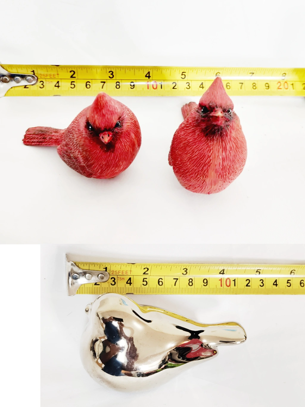 A set of decorative bird figurines. Features two red cardinal figurines, and two silver bird figurines. Great for decorating a shelf or mantle to bring a sense of serenity.