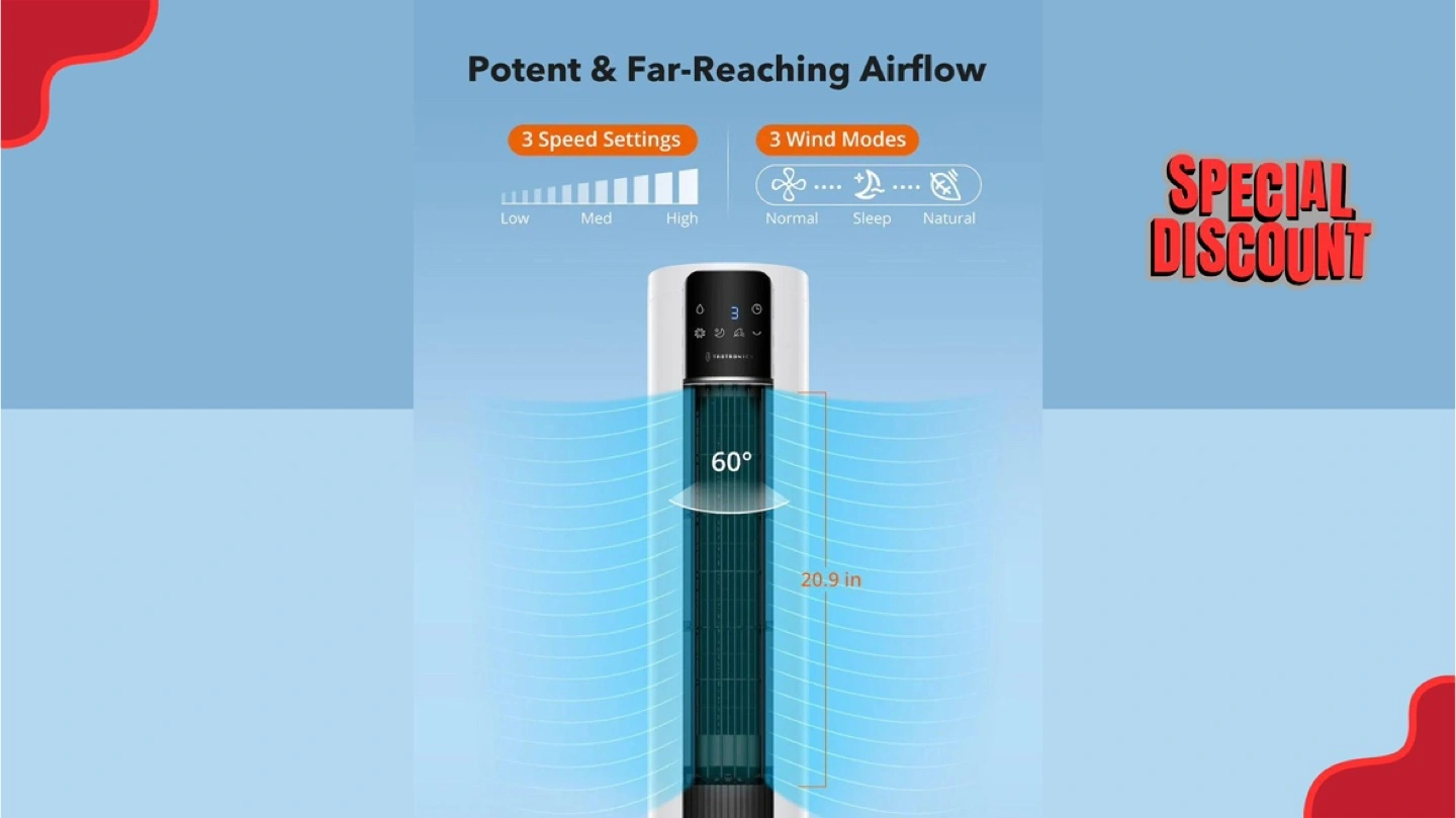 It offers 3 speed settings and 3 wind modes. Includes a remote and ice packs. You'll find this is a soothing way to beat the heat.
