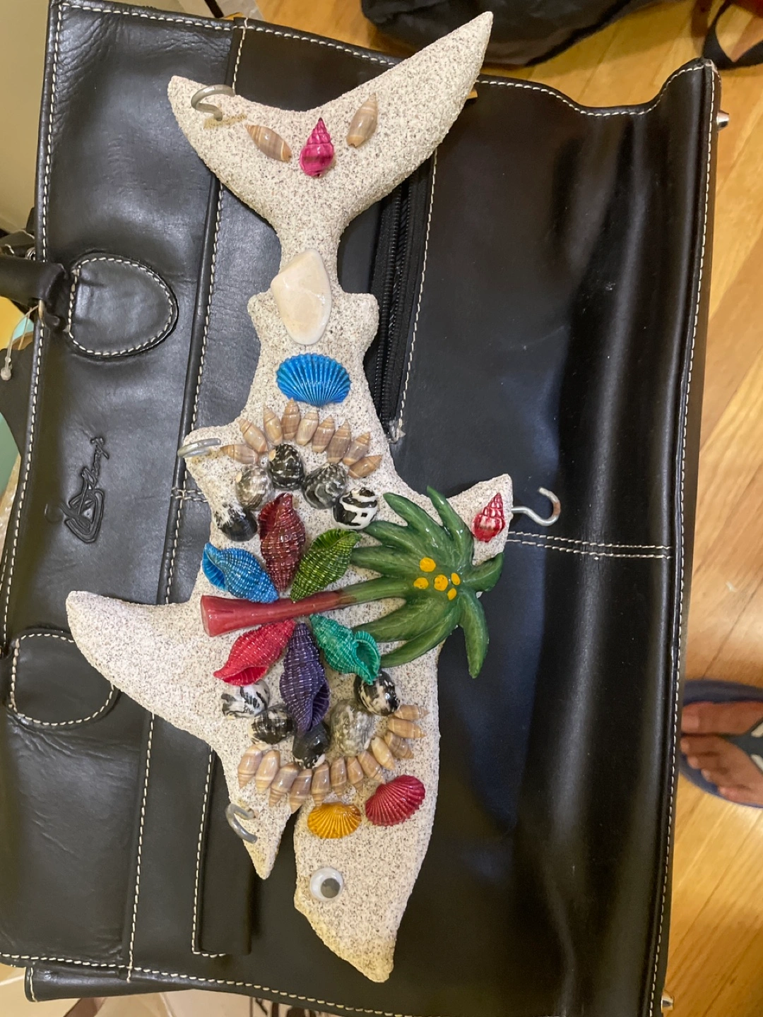 Shark shaped wall decor or keys holder. Decorated with shells and colorful accents. Featuring a wooden palm tree. Place it on a wall to create a relaxing atmosphere in your home.