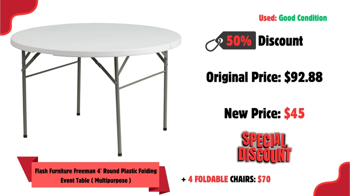 White round table with a folding base. Metal legs. Great for small gatherings, like a peaceful afternoon tea. Can come with 4 foldable chairs for70$ all