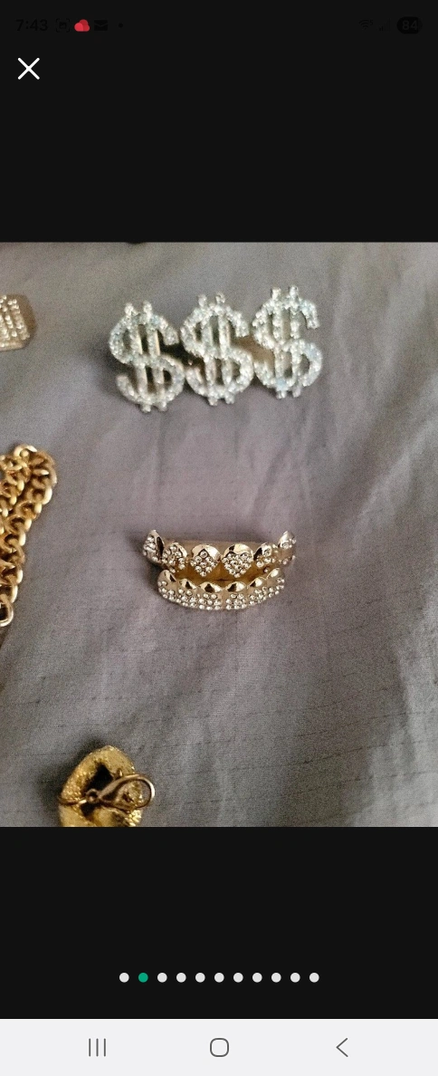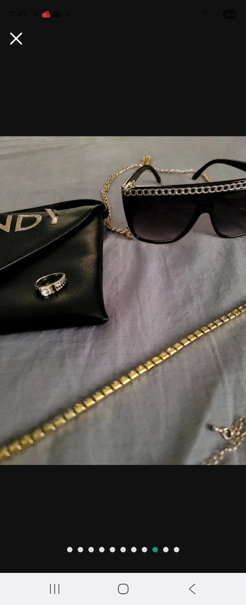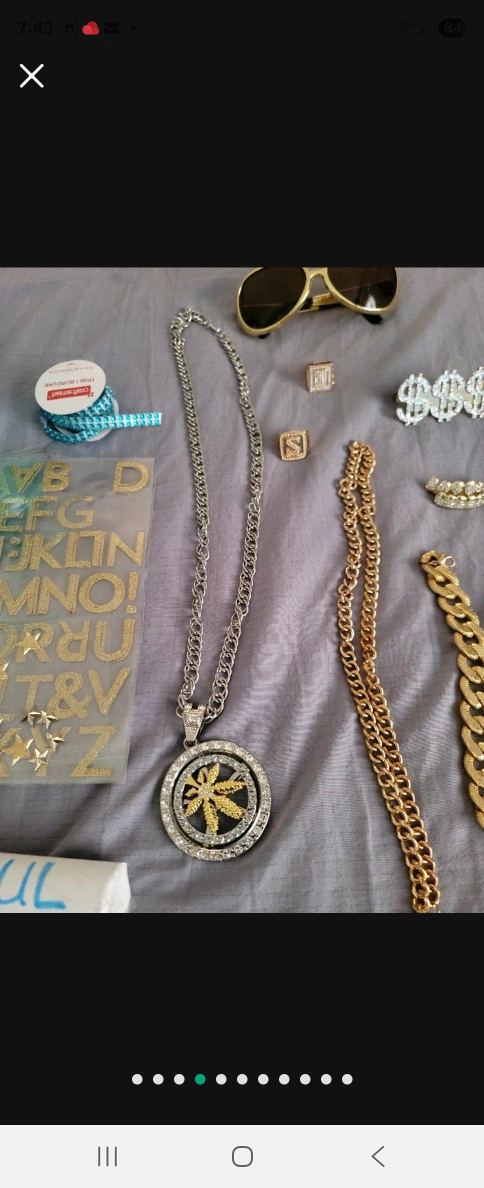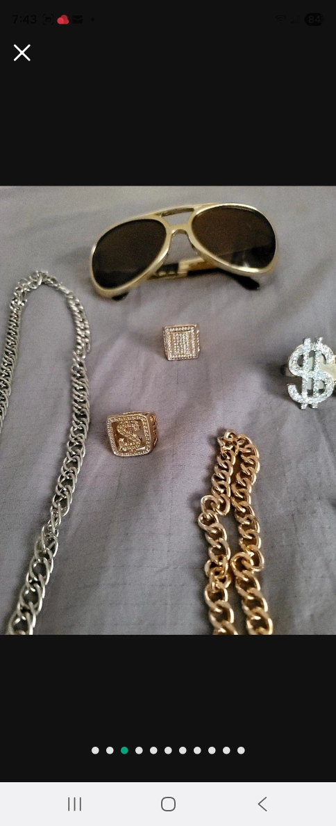 A collection of items. Includes gold-colored necklaces, rings, and bracelets. Also includes sunglasses, stickers, and a goblet. You can create a stunning, layered look by pairing some of the accessories together to achieve a unique style.