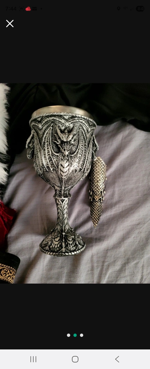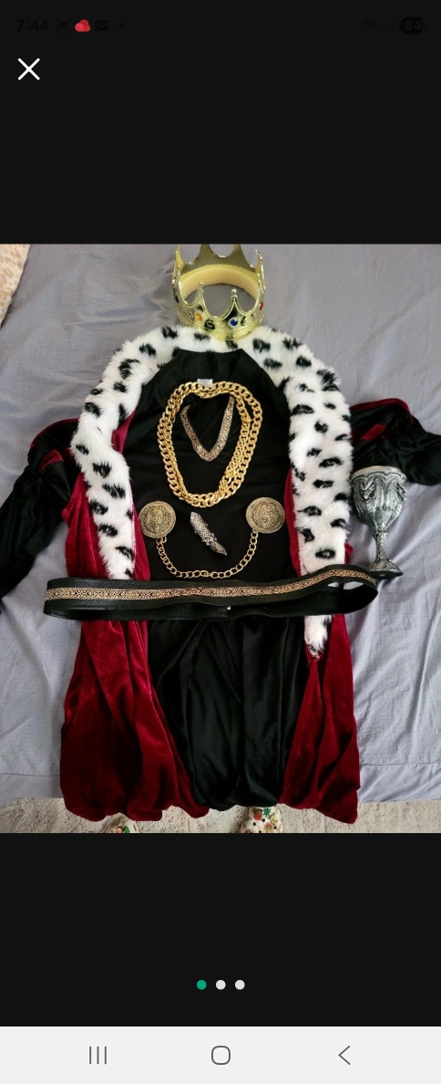A unique goblet, dragon-themed. A full costume with a crown, gold chain, belt, and robe. The items can provide a great addition to your collection, setting a relaxing vibe.
