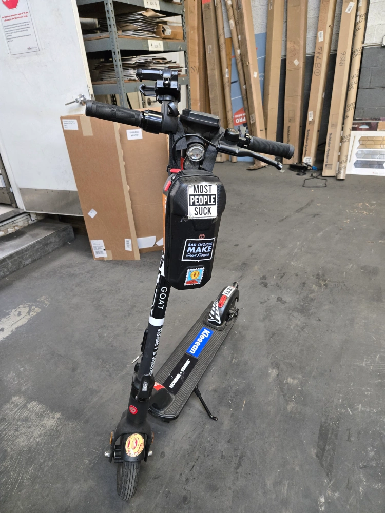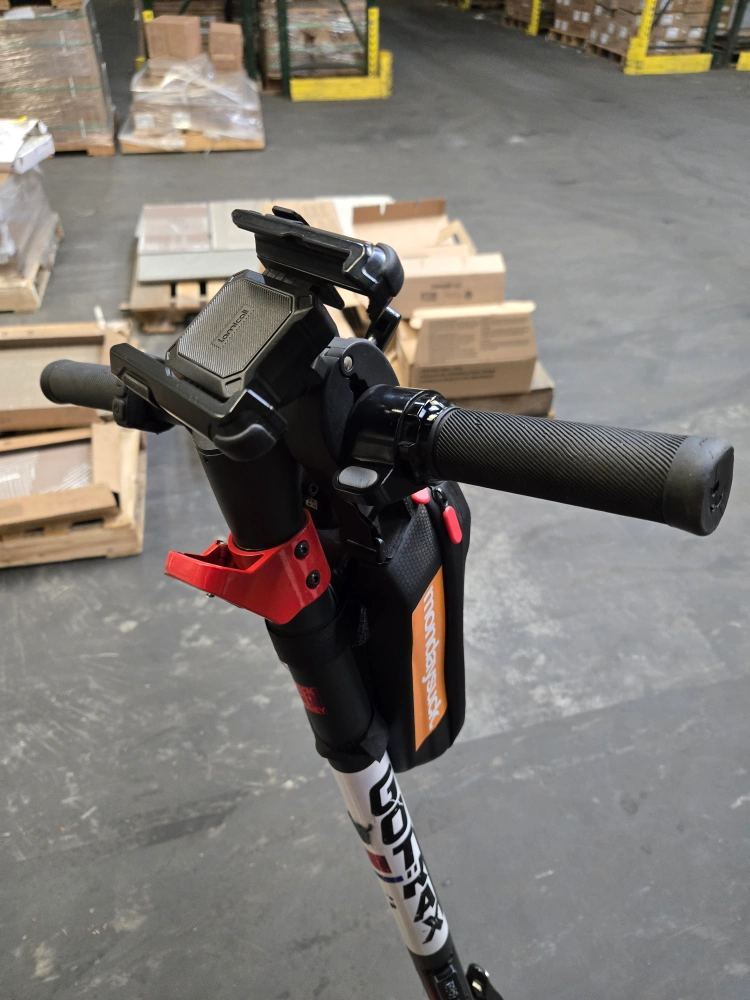 Scooter has handlebars with a digital display, a phone mount, and a bell. A bag is attached to the scooter's front. The scooter is black, with some red accents. You may find a ride on this scooter to be a wonderful experience. comes with home charger, syroage case and cell phone holder. mas speed 20miles per hrs