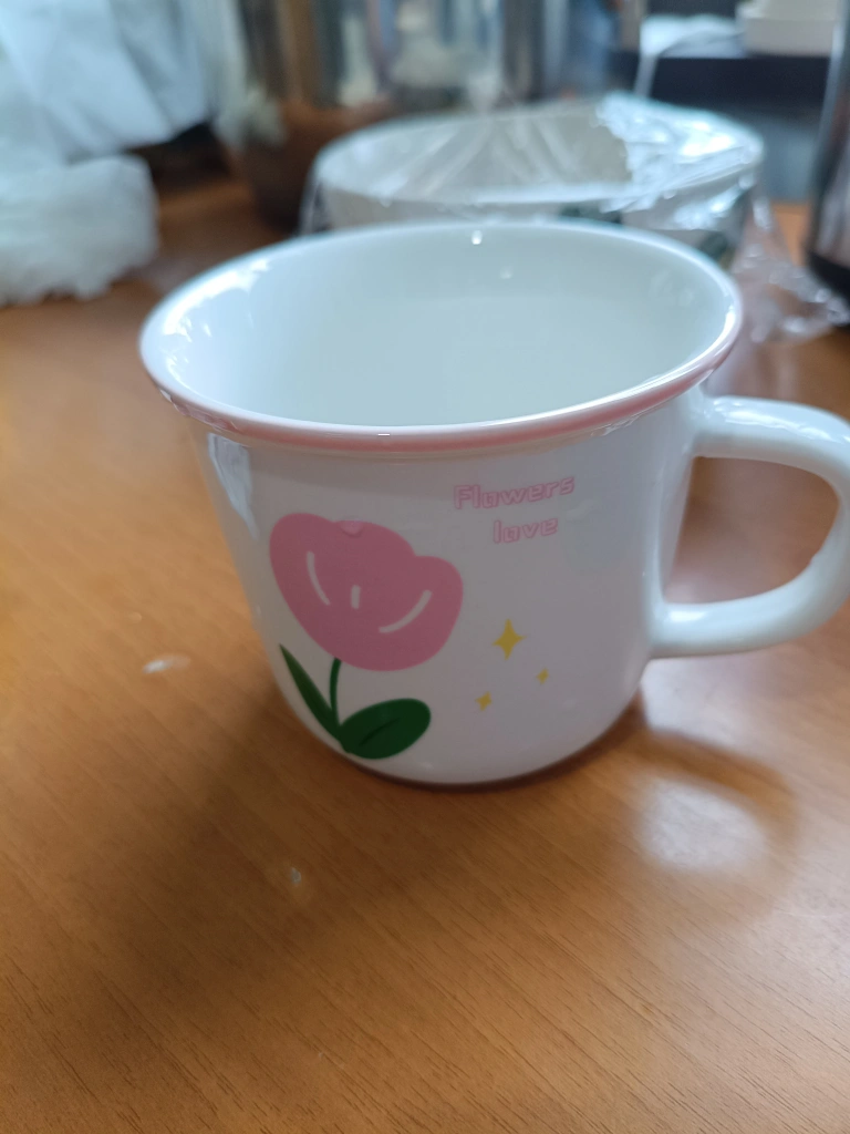 White ceramic mug. Decorated with a pink flower, green leaves, and golden stars. The rim features a pink trim. A great mug for enjoying a hot cup of tea on a rainy day.