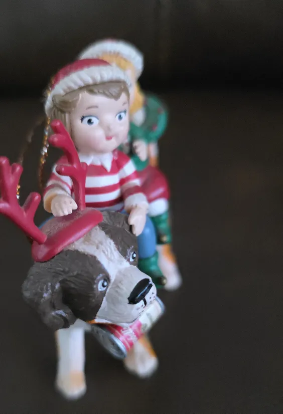 A festive ornament. Features a Campbell's kid on a dog with reindeer antlers. Another Campbell's kid sits behind. It is a great piece to add to your holiday decorations.