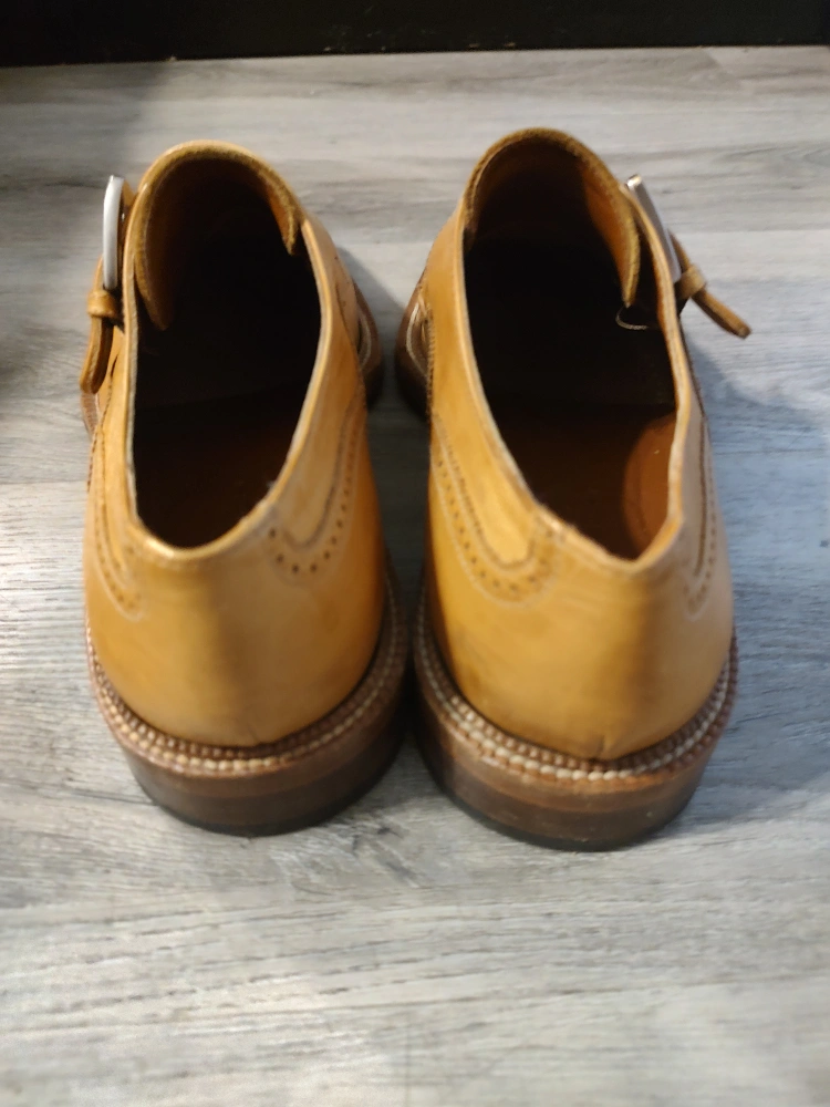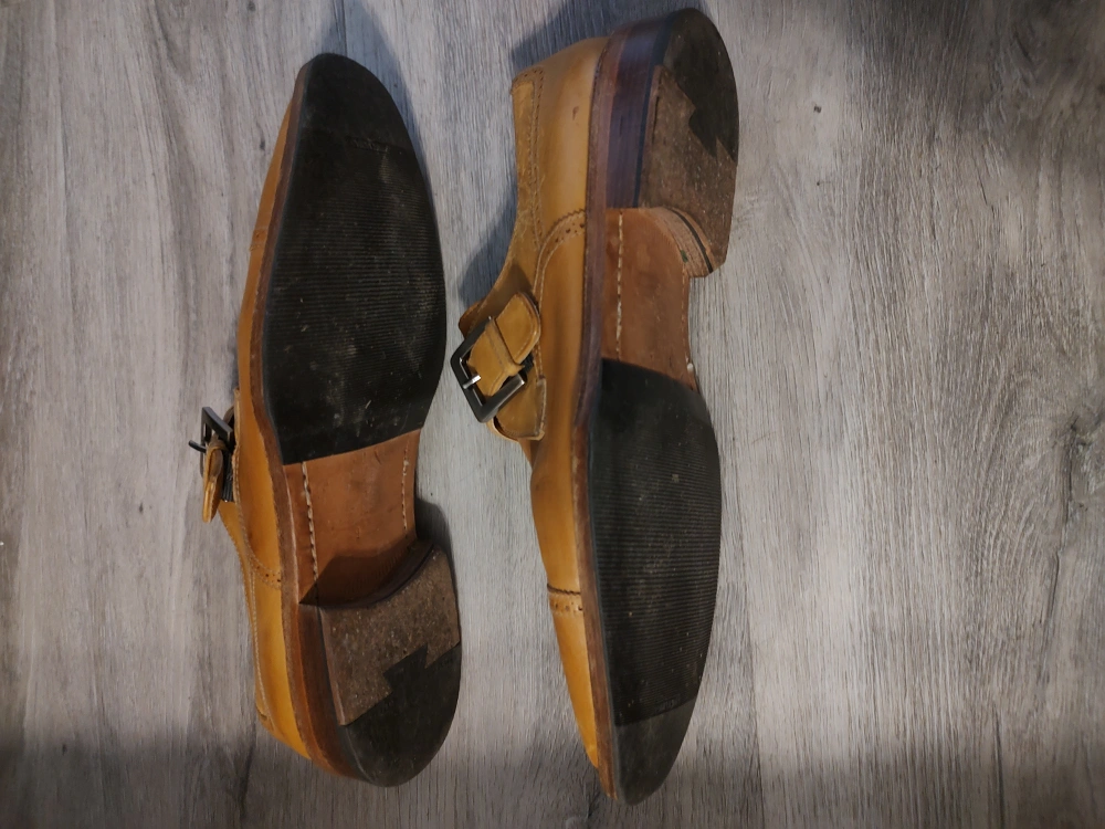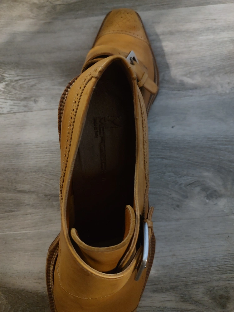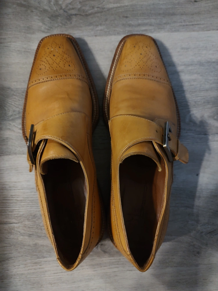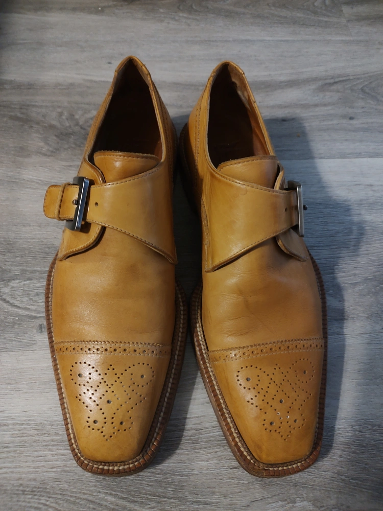 Moreschi Tan-coloured leather shoes. Monk strap design. Metal buckle details. Decorative perforations at the front. Excellent condition like new. Made in Italy. Size 9 but, fit big.